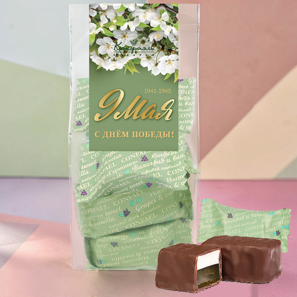 Двуслойные конфеты «9 Мая» — это не просто десерт, а особый знак уважения и памяти. Нежный мармелад с ароматом спелого винограда плавно переходит в воздушное ванильное суфле, а завершает композицию благородный горький шоколад.
