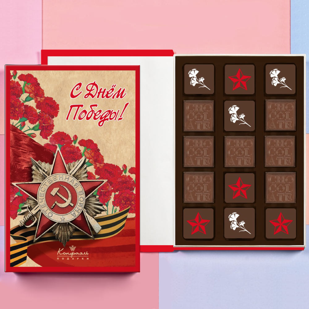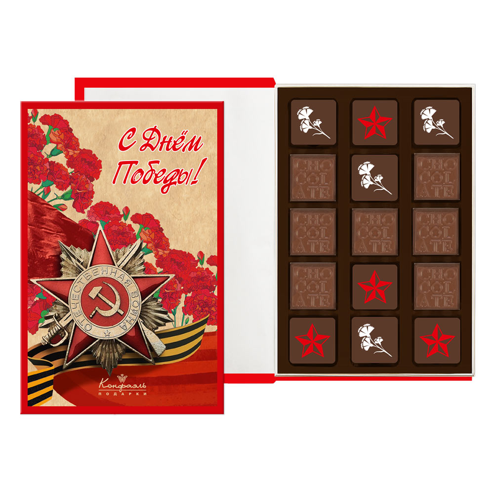 Состав: шоколадные массы - какао-масло, какао тертое, сахар, молоко сухое цельное, эмульгатор (лецитин соевый), ароматизатор («Ванилин»); начинки - сахар, патока, какао тертое, молоко сгущенное (молоко цельное, сахар (сахароза, лактоза)), сливки сгущенные с сахаром (сливки нормализованные, сахар (сахароза), лактоза), какао порошок, стабилизатор (мальтодекстрин), коньяк (дистиллят коньячный, вода, сахар, натуральный пищевой краситель «Карамельный колер»), спирт этиловый ректификованный, консервант (сорбиновая кислота), регулятор кислотности (лимонная кислота), эмульгаторы (лецитин соевый, Е471), ароматизаторы; декор - пищевые красители (куркумин, Е132, Е171), пищевой краситель (концентрированный сок красной свёклы, масло подсолнечное, эмульгаторы (мальтодекстрин, Е472с), регуляторы кислотности (лимонная кислота, аскорбиновая кислота)). Продукция производится на предприятии, где используются арахис, кунжут, орехи, яичные и молочные продукты, злаки, содержащие глютен.
