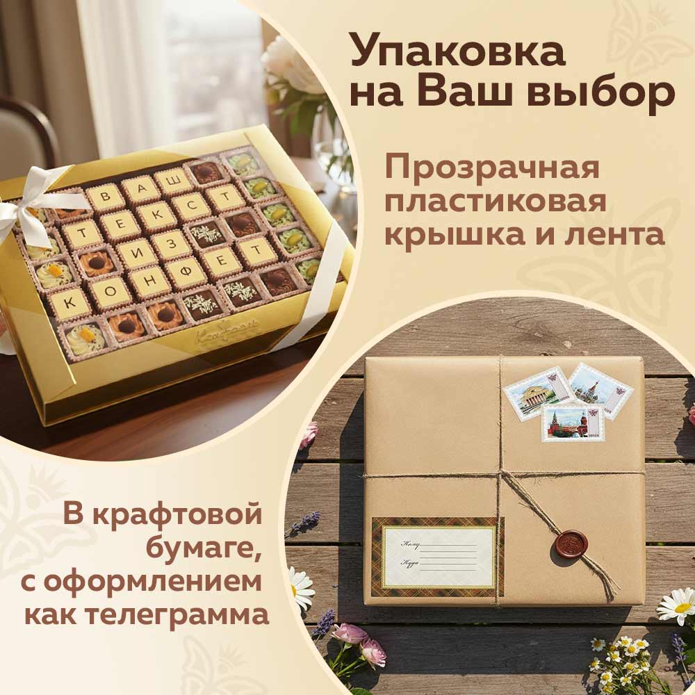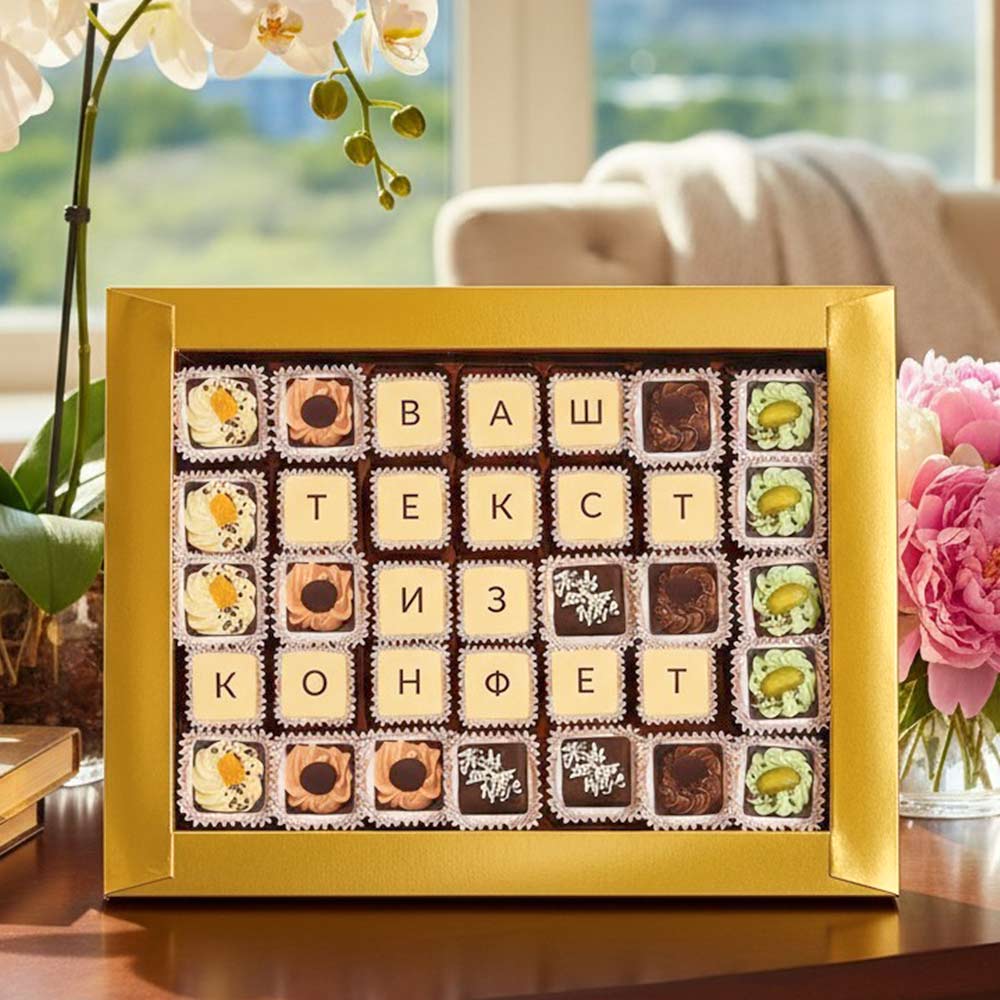 Текст выкладывается съедобной шоколадной мозаикой, которую с удовольствием съест получатель.