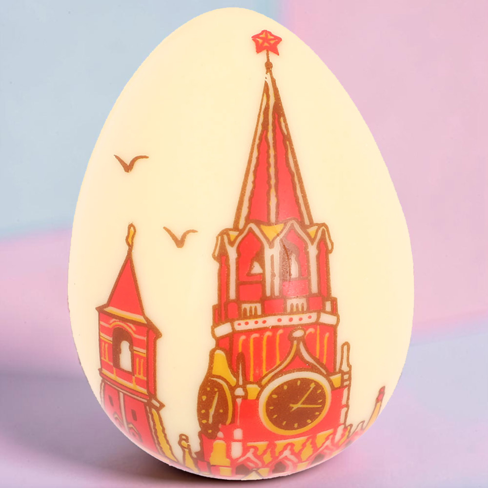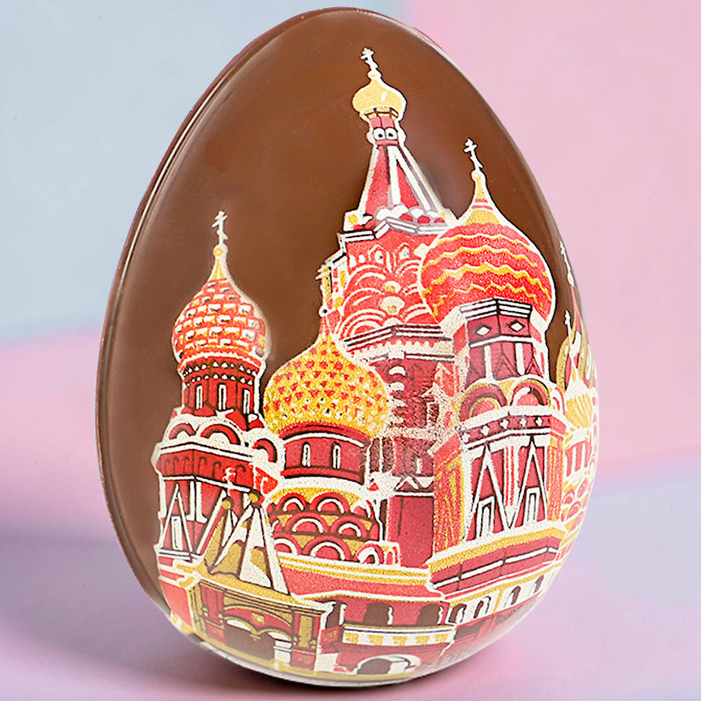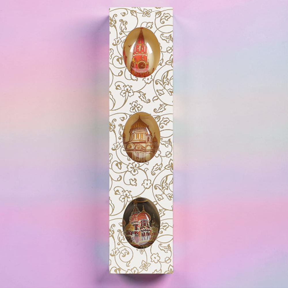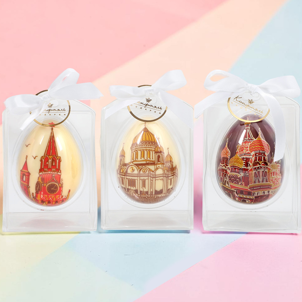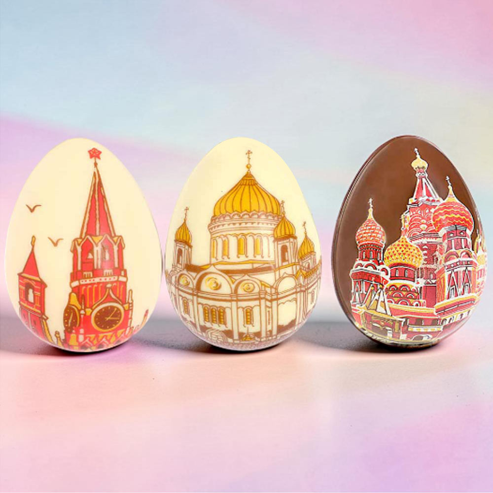 Набор пасхальных яиц из молочного шоколада, покрытого художественной росписью из сладкого декора. Станет эффектным украшением вашего праздничного стола.