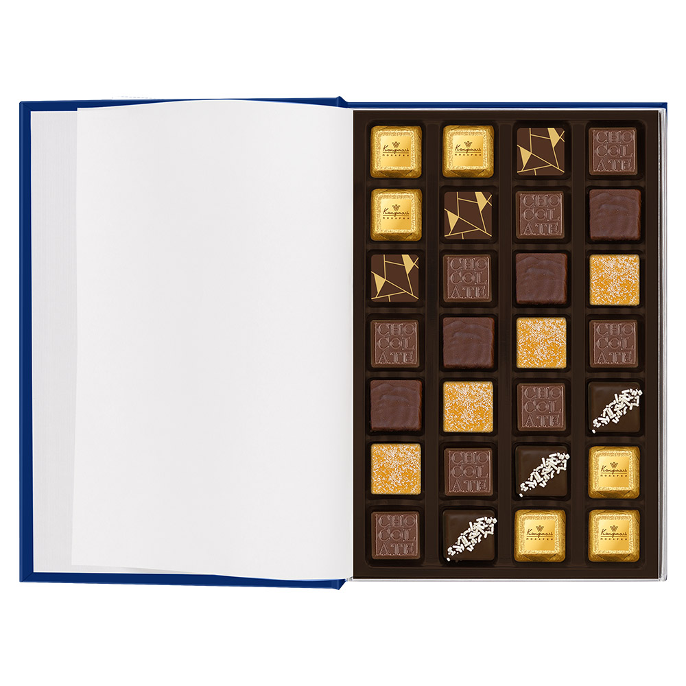 Состав: шоколад - сахар, какао тёртое, масло какао, сыворотка молочная сухая, сухое цельное молоко, эмульгатор (лецитин соевый), ароматизаторы; начинки - сахар, патока, какао-масло, какао тертое, молоко сгущенное (молоко цельное, сахар (сахароза, лактоза)), жир специального назначения (масло ши, рапсовое масло, соевое масло, антиокислитель( лимонная кислота)), молоко сухое цельное, молоко сухое обезжиренное, белый шоколад (сахар, молоко сухое цельное, масло какао, эмульгатор (лецитин соевый), ароматизатор, соль), масла растительные рафинированные дезодорированные (подсолнечное, рапсовое, оливковое; масло сладко-сливочное, молоко сухое обезжиренное), масло сладко - сливочное, белок яичный порошкообразный, натуральный концентрированный сок (апельсина), клубника сушеная, кумкват сушеный, вафельная крошка (мука пшеничная х/п первого сорта, сахар, масло кокосовое рафинированное дезодорированное, эмульгатор (лецитин соевый), пшеничные волокна (клетчатка), ароматизатор), цукаты лимонных корочек, папайя сушеная, ананас сушеный, финики, слива свежая, абрикос свежий, ядра орехов фундука, ядра орехов миндаля,стабилизаторы (мальтодекстрин), желирующий агент (агар), желатин говяжий, коньяк (дистиллят коньячный, вода, сахар, пищевой краситель (сахарный колер)), спирт этиловый ректификованный, консервант (сорбиновая кислота), регулятор кислотности (лимонная кислота), эмульгаторы (лецитин соевый, Е471), ароматизаторы, пищевые красители (сахарный колер, куркумин, медные комплексы хлорофиллов и хлорофиллинов); декор - пищевые красители (Е171, куркумин).