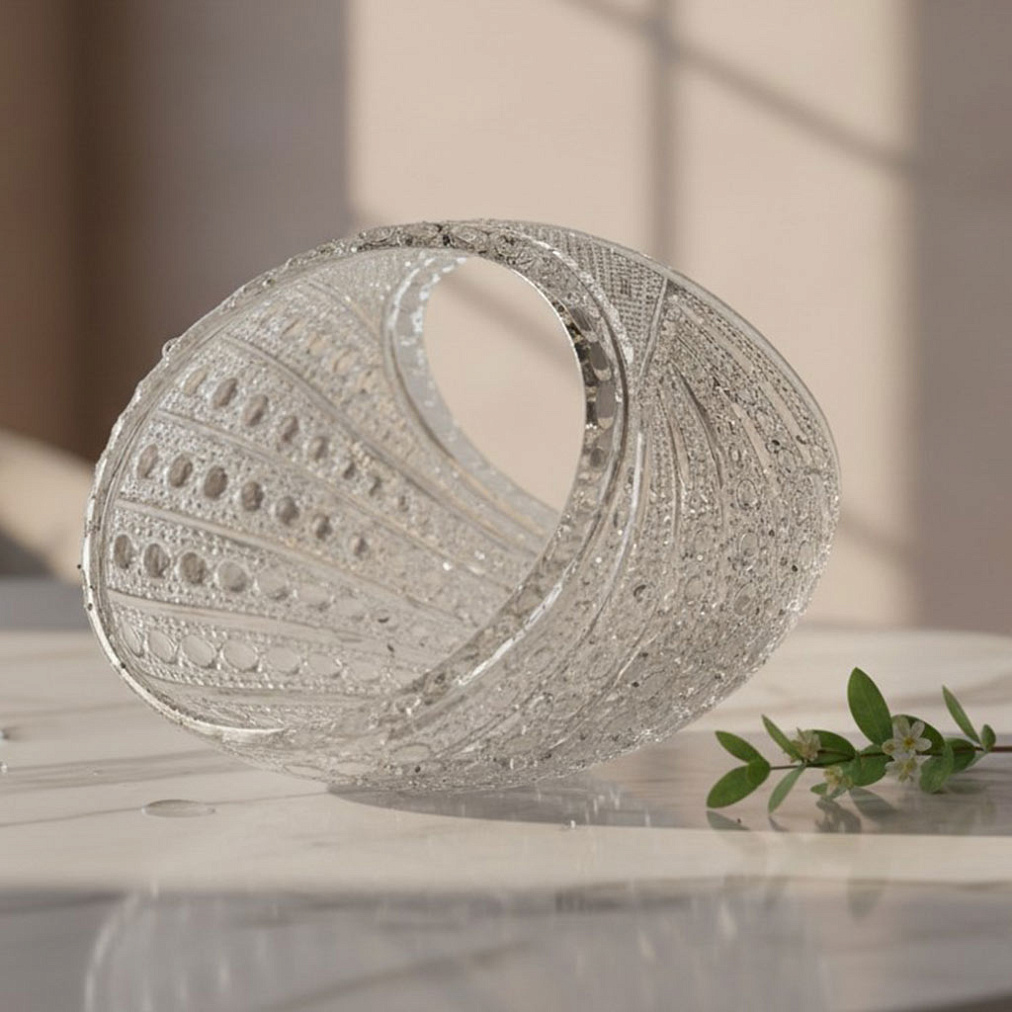 Эта модель — воплощение современного дизайна и мастерства стеклодувов. Чёткие геометрические линии и игра света в гранях хрусталя создают эффект динамичного объёма, который притягивает взгляды.
