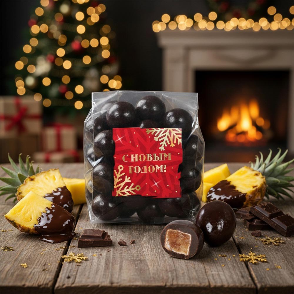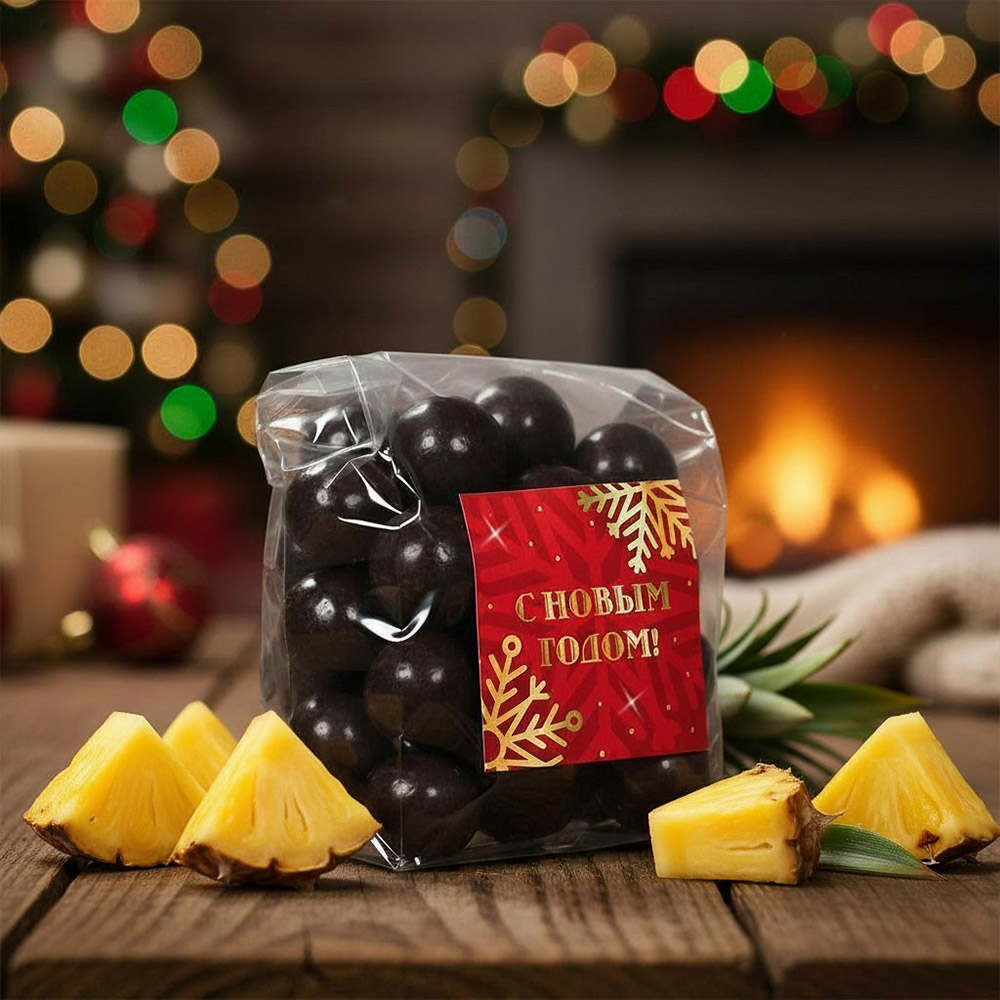 Состав: ананас сушеный, сахар, тертое какао, масло какао, патока, какао-порошок, эмульгатор (лецитин соевый), натуральная ваниль, глазирователь (капол). Продукция производится на предприятии, где используются арахис, кунжут, орехи, яичные и молочные продукты, злаки, содержащие глютен.