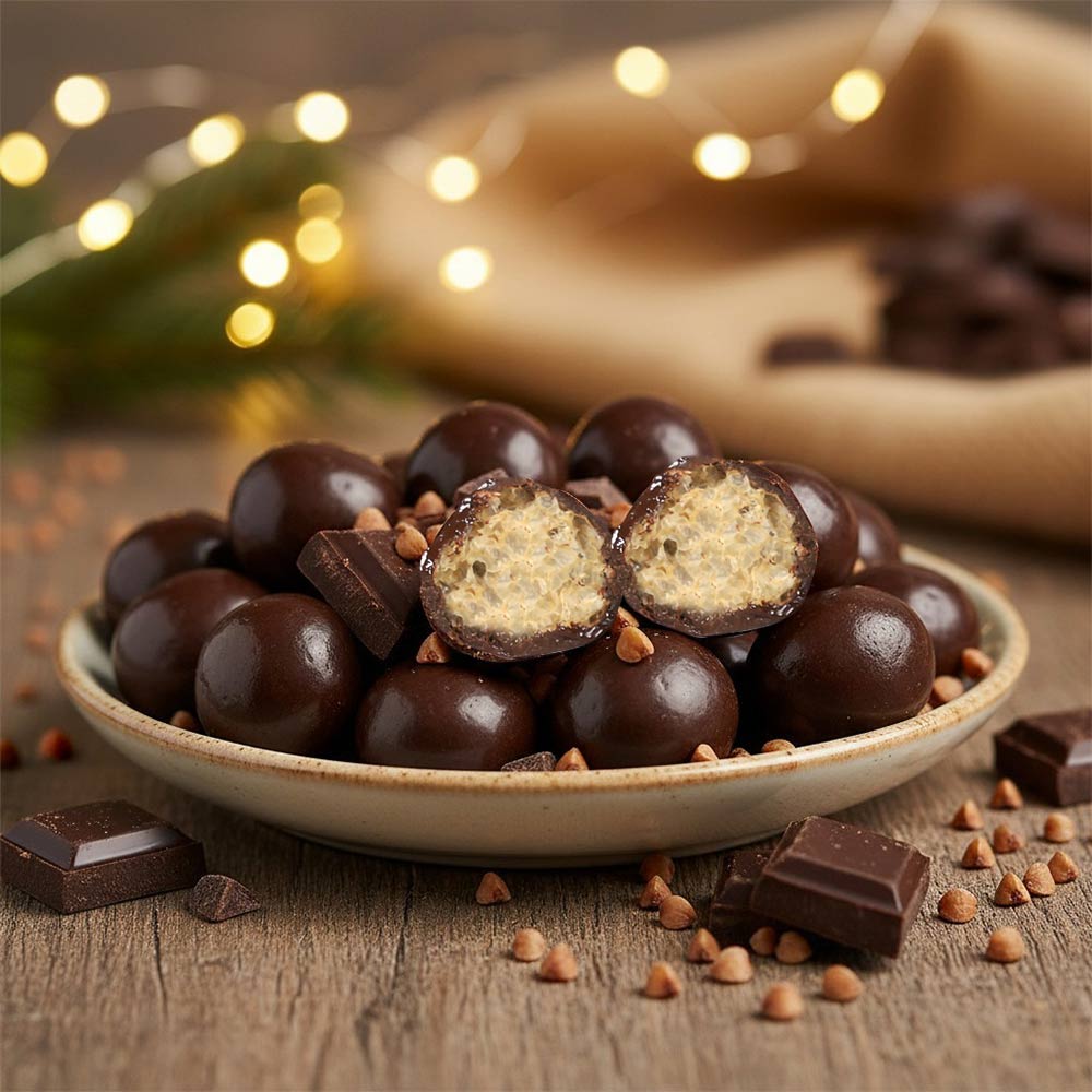 Состав: сахар, тертое какао, масло какао, какао-порошок, эмульгатор (лецитин соевый), натуральная ванил; цельная гречневая крупа, витамины В1, В2, В6, РР, фолиевая кислота, глазирователь (капол). Продукция производится на предприятии, где используются арахис, кунжут, орехи, яичные и молочные продукты, злаки, содержащие глютен.