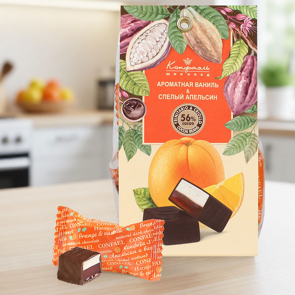 шоколадная масса - какао тертое, сахар, какао-масло, эмульгатор (лецитин соевый), ароматизатор ("Ванилин"), начинки - сахар, патока, молоко сгущенное (молоко цельное, сахар (сахароза, лактоза)), масло сладко-сливочное, натуральный концентрированный апельсиновый сок, яичный белок сухой, желирующие агенты (агар, желатин говяжий), консервант (сорбиновая кислота), регулятор кислотности (лимонная кислота), эмульгатор (Е471), ароматизаторы, натуральный экстракт ванили.