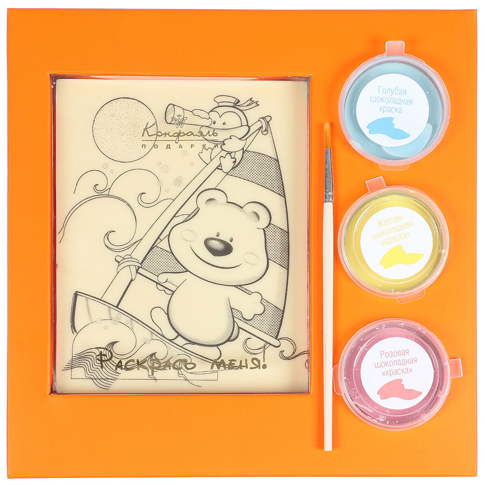 Лучший подарок ребёнку, тот, с которым он может играть! Шоколадная раскраска, выполненная из лучших какао-бобов, не только развлечёт, но и угостит малыша. Весёлый медвежонок предлагает не только полакомиться шоколадом, но и поиграть в художника-шоколатье. Подготовьте съедобные краски (надо растопить цветную глазурь), устройте своему малышу рабочее место и наблюдайте за тем, как он делает ярче приключение медведя. Результат можно съесть!