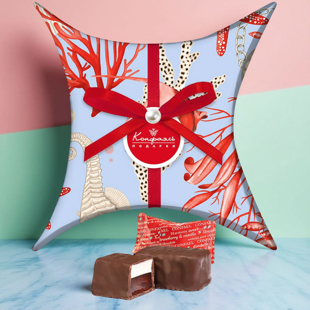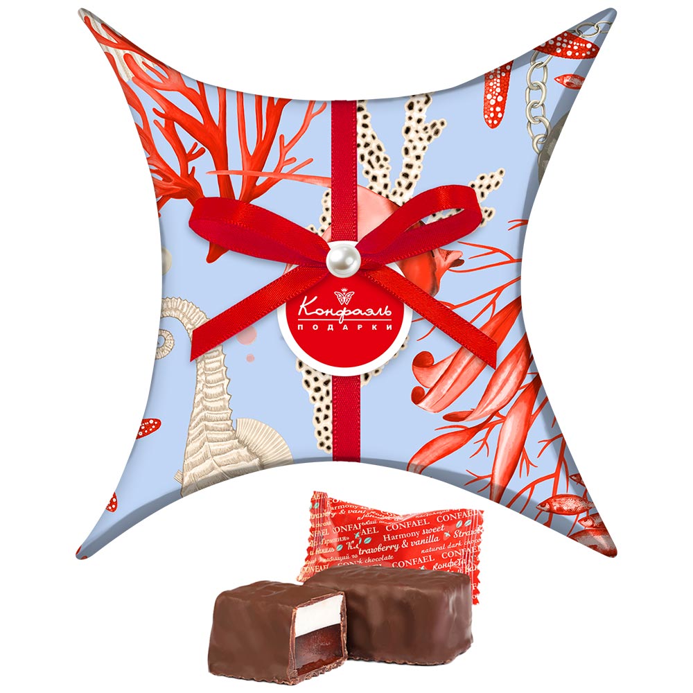 Состав: шоколадные массы – сахар, какао тёртое, масло какао, эмульгатор (лецитин соевый), ароматизатор; начинки – сахар, патока, молоко сгущенное (молоко цельное, сахар (сахароза, лактоза)), масло сладко-сливочное, яичный белок, натуральный концентрированный клубничный сок, желирующие агенты (агар, желатин говяжий), консервант (сорбиновая кислота), регулятор кислотности (лимонная кислота), эмульгатор (Е471), ароматизаторы, натуральный экстракт ванили. Продукция производится на предприятии, где используются арахис, кунжут, орехи, яичные и молочные продукты, злаки, содержащие глютен.