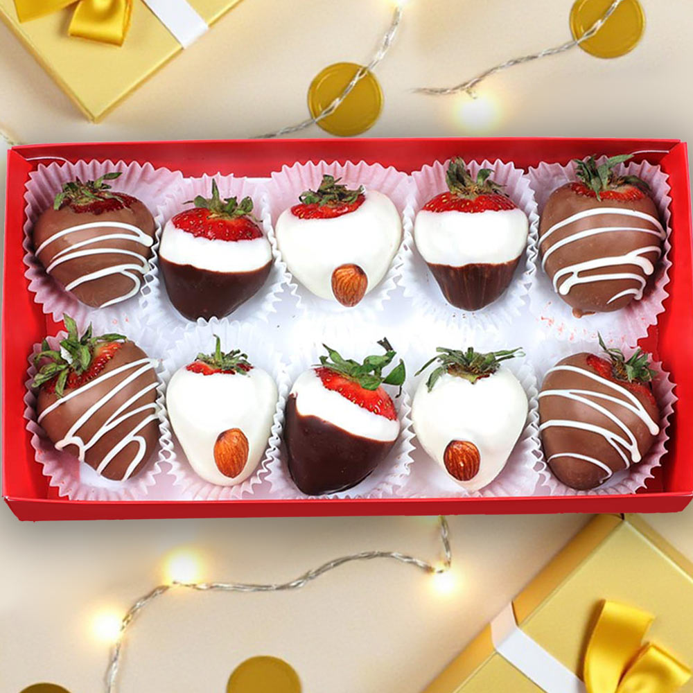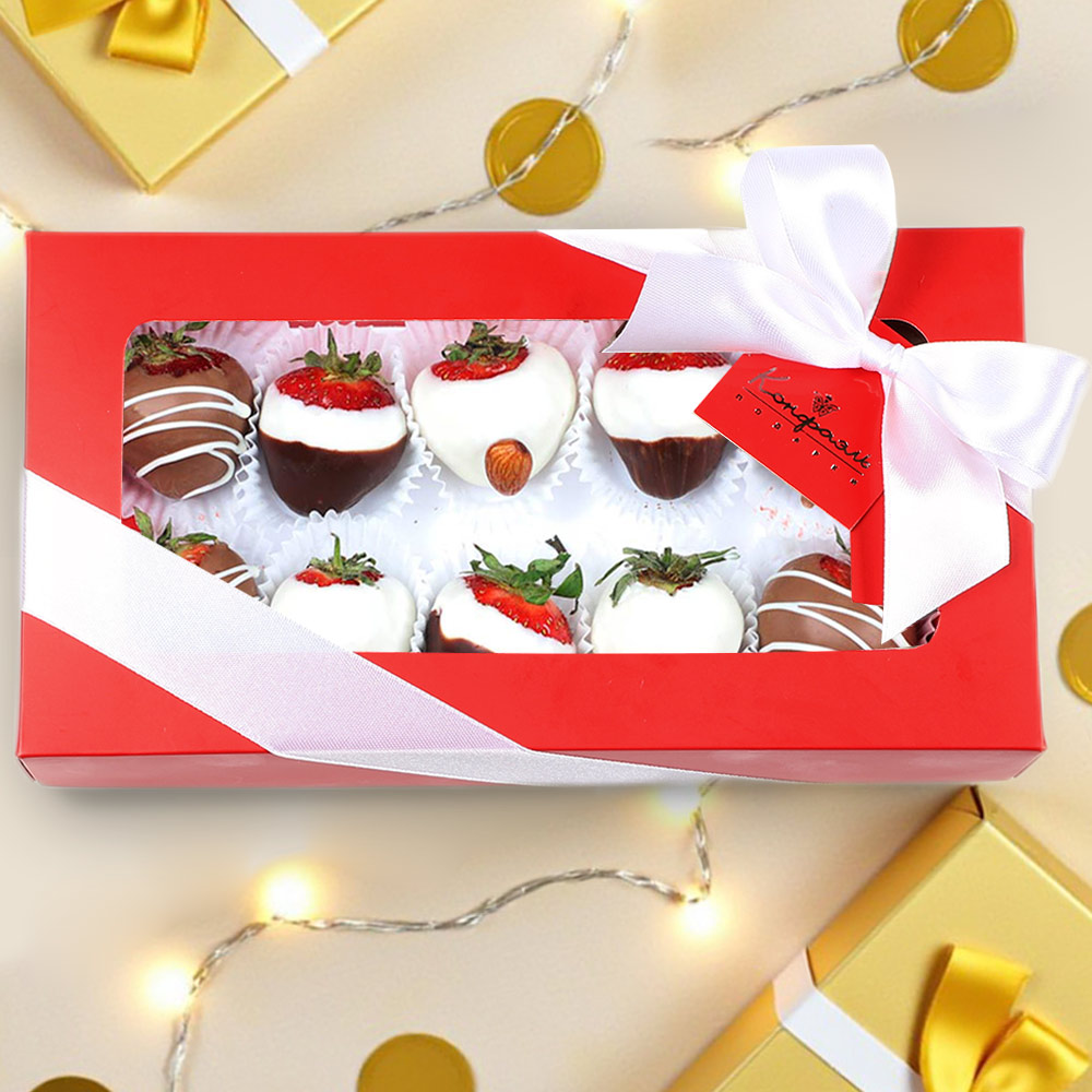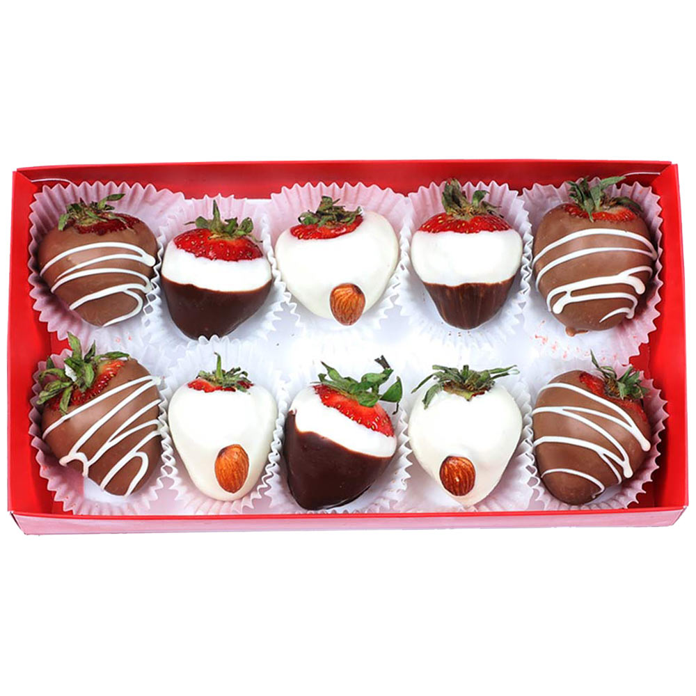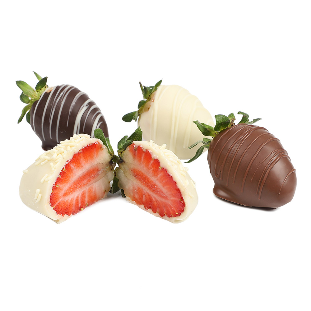 Конфеты глазированные "Клубника в шоколаде" с декором белым, горьким, молочным шоколадом и миндалем