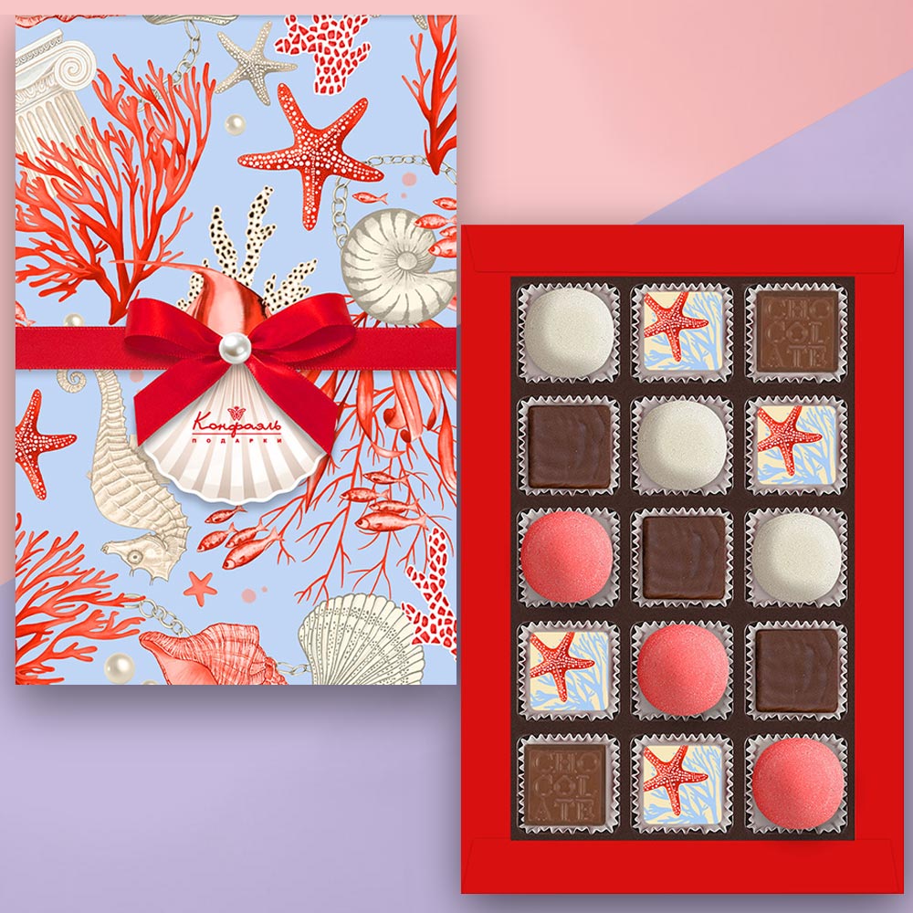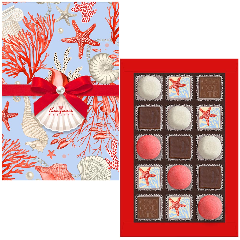 Состав: шоколад – сахар, масло какао, сыворотка молочная сухая, сухое цельное молоко, какао тёртое, эмульгатор (лецитин соевый), ароматизаторы, соль; начинки – сахар, патока, жир специального назначения (масло ши, рапсовое масло, соевое масло, антиокислитель( лимонная кислота)), молоко сухое цельное, молоко сухое обезжиренное, белый шоколад (сахар, молоко сухое цельное, масло какао, эмульгатор (лецитин соевый), ароматизатор, соль), молоко сгущенное (молоко цельное, сахар (сахароза, лактоза)), масло сладко - сливочное, белок яичный порошкообразный, вафельная крошка (мука пшеничная х/п первого сорта, сахар, масло кокосовое рафинированное дезодорированное, эмульгатор (лецитин соевый), пшеничные волокна (клетчатка), ароматизатор), желирующий агент (агар), желатин говяжий, консервант (сорбиновая кислота), регулятор кислотности (лимонная кислота), эмульгаторы (лецитин соевый, Е471), ароматизаторы, пищевые красители (сахарный колер, Е171, красный свекольный, паприка, медные комплексы хлорофиллов и хлорофиллинов); декор – пищевые красители (Е132, Е171, красный свекольный). Внимание! Продукция производится на предприятии, где используются арахис, кунжут, орехи, яичные и молочные продукты, злаки, содержащие глютен.