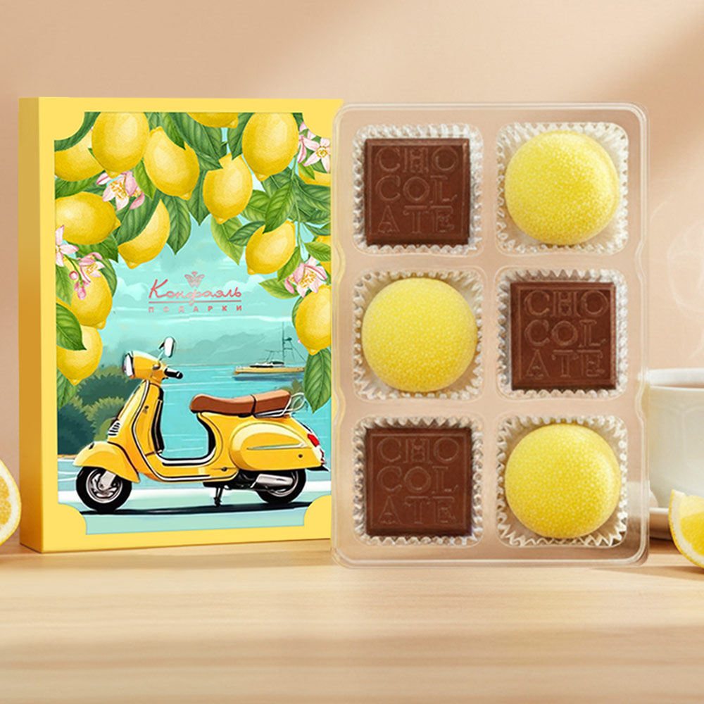Состав: шоколад - сахар, масло какао, сыворотка молочная сухая, сухое цельное молоко, какао тёртое, эмульгатор (лецитин соевый), ароматизаторы; начинки - сахар, патока, жир специального назначения (масло ши, рапсовое масло, соевое масло, антиокислитель( лимонная кислота)), молоко сухое цельное, молоко сухое обезжиренное, белый шоколад (сахар, молоко сухое цельное, масло какао, эмульгатор (лецитин соевый), ароматизатор, соль, вафельная крошка (мука пшеничная х/п первого сорта, сахар, масло кокосовое рафинированное дезодорированное, эмульгатор (лецитин соевый), пшеничные волокна (клетчатка), ароматизатор), желирующий агент (агар), желатин говяжий, пищевые красители ( Е171, куркумин, медные комплексы хлорофиллов и хлорофиллинов).