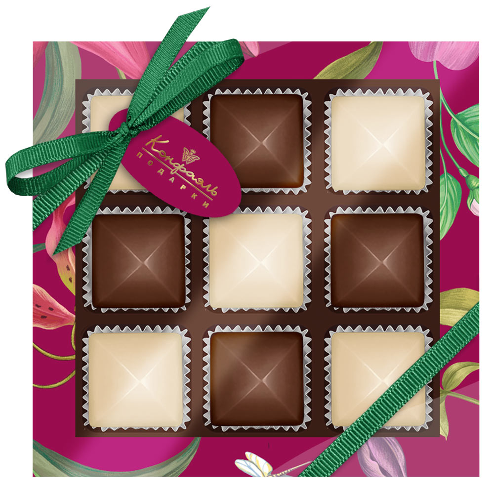Состав: шоколад - сахар, масло какао, сыворотка молочная сухая, сухое цельное молоко, какао тёртое, эмульгатор (лецитин соевый), ароматизаторы, соль; начинки - сахар, патока, какао-масло, какао тертое, молоко сгущенное (молоко цельное, сахар (сахароза, лактоза)), жир специального назначения (масло ши, рапсовое масло, соевое масло, антиокислитель( лимонная кислота)), молоко сухое цельное, молоко сухое обезжиренное, белый шоколад (сахар, молоко сухое цельное, масло какао, эмульгатор (лецитин соевый), ароматизатор, соль), стабилизатор (мальтодекстрин), коньяк (дистиллят коньячный, вода, сахар, пищевой краситель (сахарный колер)), спирт этиловый ректификованный, консервант (сорбиновая кислота), регулятор кислотности (лимонная кислота), эмульгаторы (лецитин соевый, Е471), ароматизаторы.