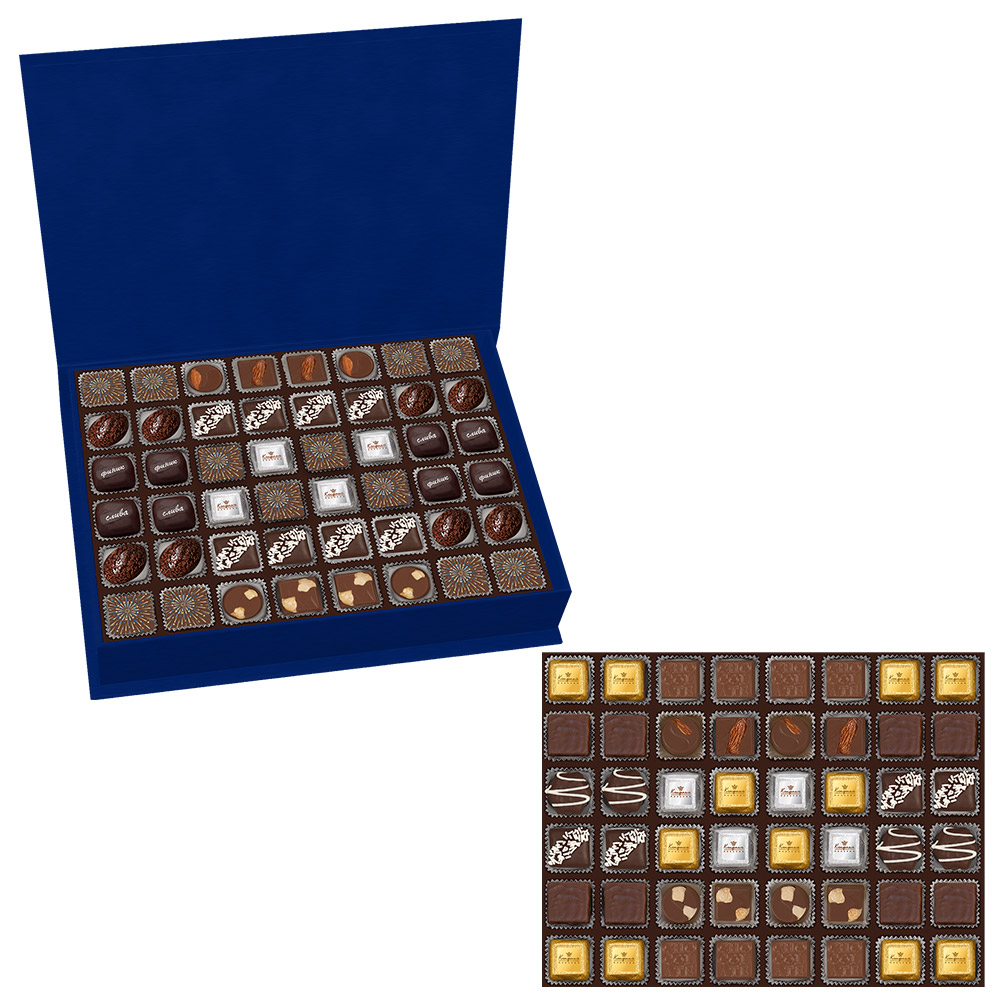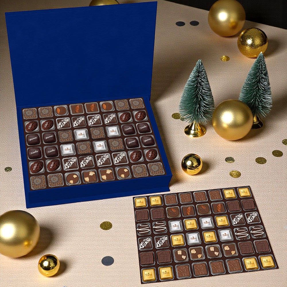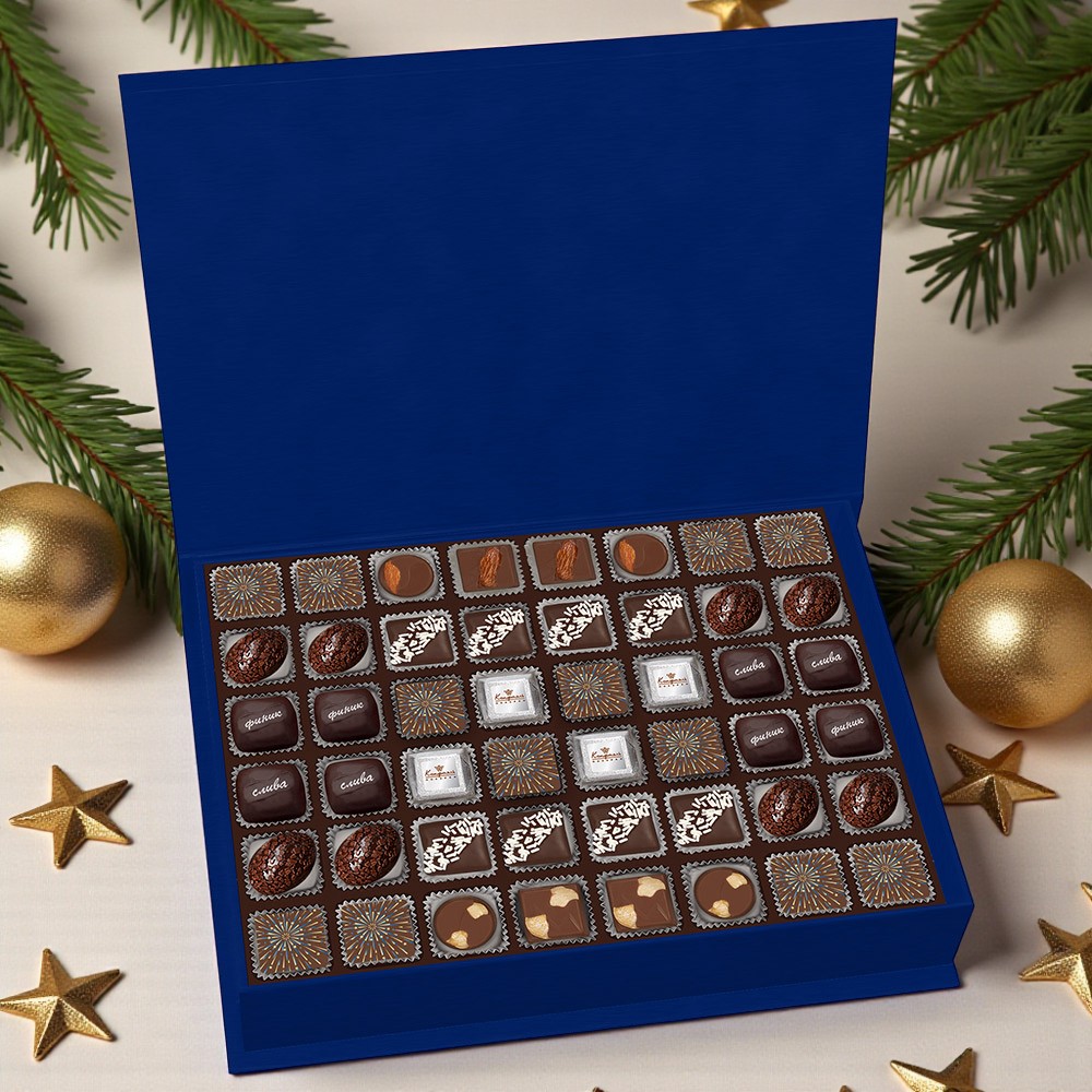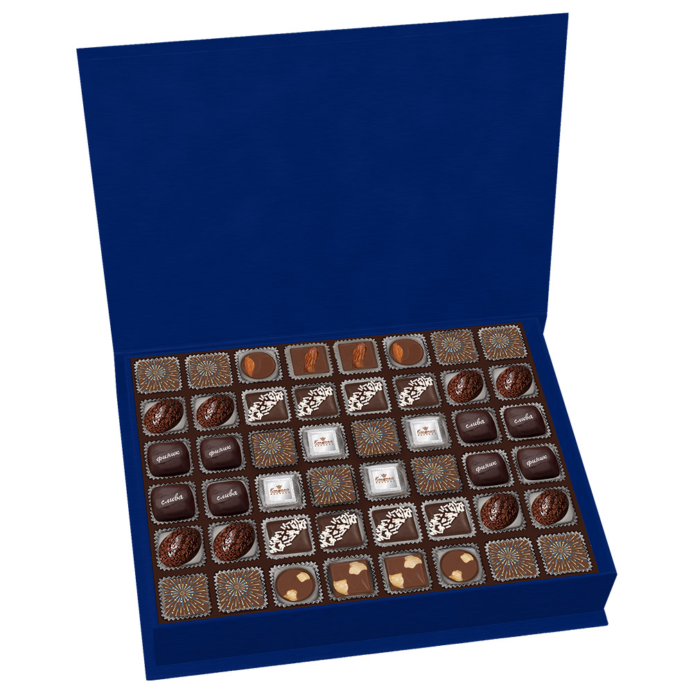 Состав: шоколадные массы – сахар, масло какао, молоко цельное сухое, сухое обезжиренное молоко, какао тертое, какао-порошок, сыворотка молочная сухая, пахта сухая, молочный жир, паста ореховая из ядер фундука, эмульгаторы (соевый лецитин, Е476), соль, натуральная ваниль, ароматизаторы; начинки – сахар, патока, белок яичный порошкообразный, молоко сухое, масла растительные рафинированные дезодорированные (подсолнечное, рапсовое, оливковое; масло сладко-сливочное, молоко сухое обезжиренное), молоко сгущенное (молоко цельное, сахар (сахароза, лактоза)), жир специального назначения (масло ши, рапсовое масло, соевое масло, антиокислитель( лимонная кислота)), молоко сухое цельное, молоко сухое обезжиренное, белый шоколад (сахар, масло какао, сухое обезжиренное молоко, сухое цельное молоко, эмульгатор (лецитин соевый), экстракт ванили), натуральный концентрированный апельсиновый сок, какао тертое, какао масло, клубника сушеная, кумкват сушеный, цукаты лимонных корочек, папайя сушеная, ананас сушеный, финики, чернослив, абрикос сушеный, ядра орехов фундука, ядра орехов миндаля, марципановая масса, стабилизатор (мальтодекстрин), желирующий агент (агар), желатин говяжий, коньяк (дистиллят коньячный, вода, сахар, пищевой краситель (сахарный колер)), спирт этиловый ректификованный, консервант (сорбиновая кислота), регулятор кислотности (лимонная кислота), эмульгаторы (лецитин соевый, Е471), ароматизаторы, пищевые красители (сахарный колер, куркумин, медные комплексы хлорофиллов и хлорофиллинов); декор – пищевые красители (Е132, Е172, Е171, куркумин, красный свекольный).
