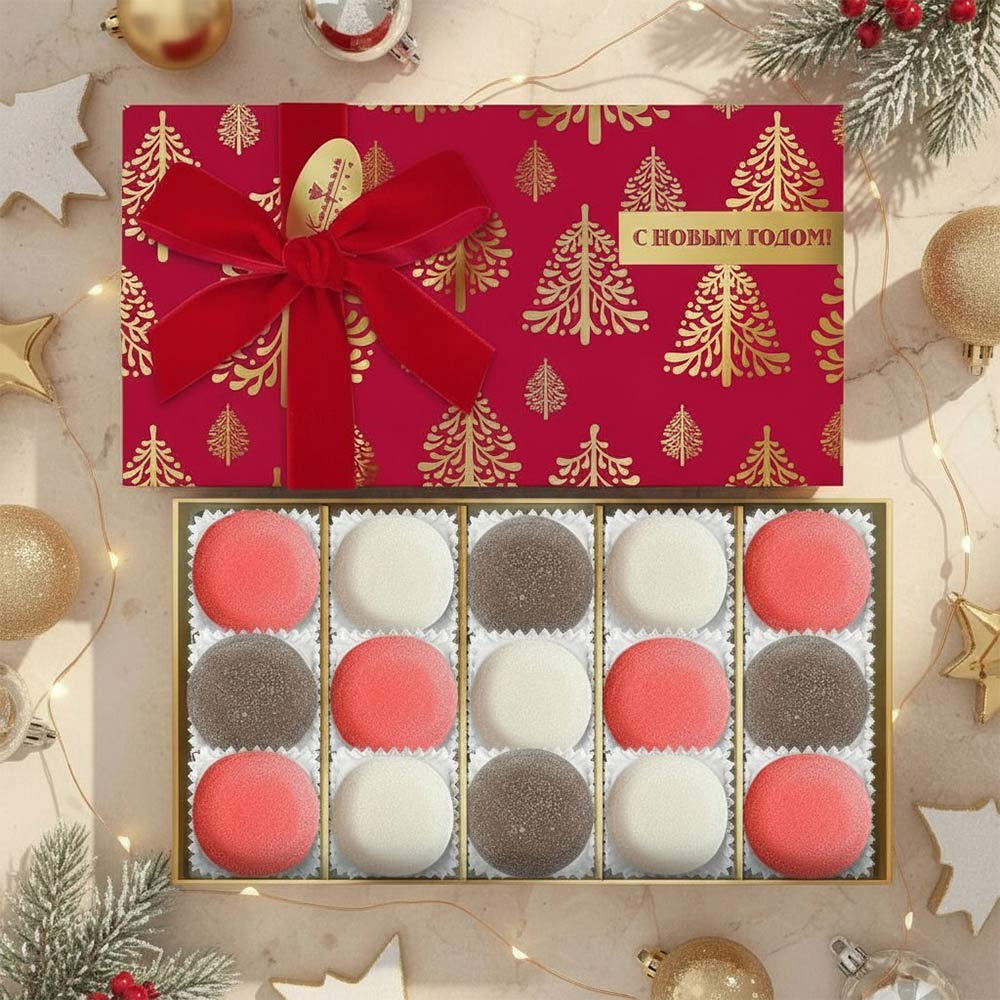 Состав: сахар, патока крахмальная карамельная, желирующий агент (агар), желатин говяжий, регулятор кислотности (лимонная кислота), ароматизаторы, пищевые красители (Е171, красный свекольный, «Сахарный колер»).