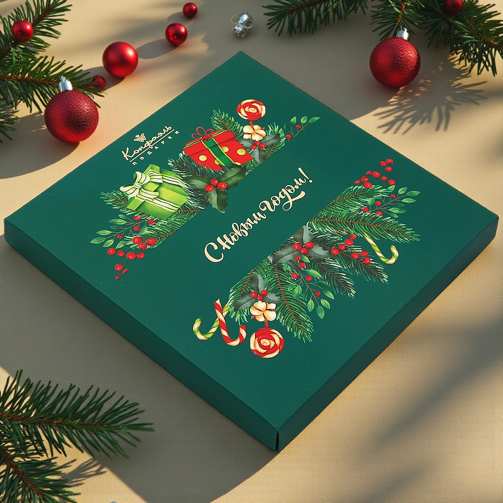 Праздничный дизайн. Конфетные наборы оформлены в новогодней стилистике.