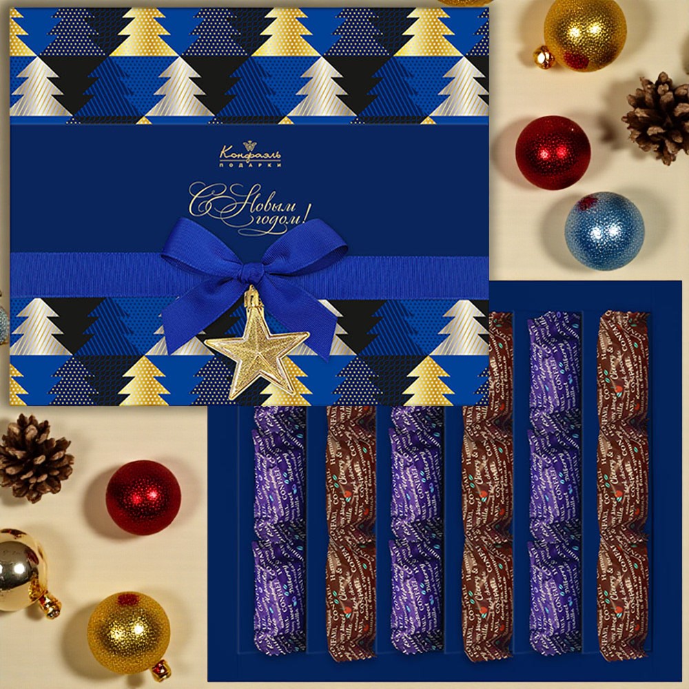 Состав: шоколадная масса – сахар, тертое какао, масло какао, какао-порошок, эмульгатор (лецитин соевый), натуральная ваниль; начинки – сахар, патока, молоко сгущенное (молоко цельное, сахар (сахароза, лактоза)), масло сладко-сливочное, белок яичный, натуральные концентрированные соки (черничный, вишневый), желирующие агенты (агар, желатин говяжий), регулятор кислотности (лимонная кислота), ароматизаторы. Продукция производится на предприятии, где используются арахис, кунжут, орехи, яичные и молочные продукты, злаки, содержащие глютен.