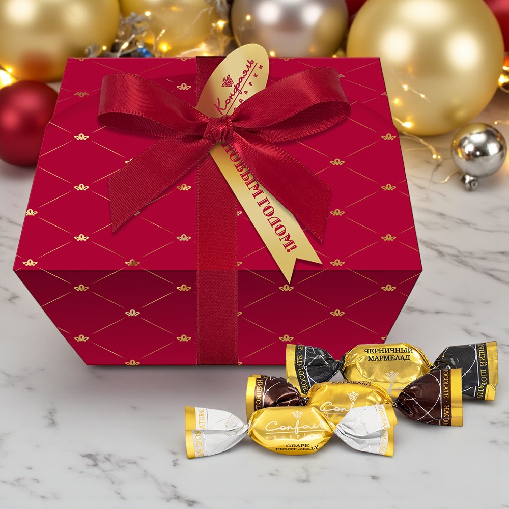 Состав: шоколадная масса – сахар, тертое какао, масло какао, какао-порошок, эмульгатор (лецитин соевый), натуральная ваниль; начинка – сахар, патока, концентрированные натуральные соки (вишневый, черничный, виноградный), желирующие агенты (агар, желатин говяжий), регулятор кислотности (лимонная кислота), ароматизаторы. Продукция производится на предприятии, где используются арахис, кунжут, орехи, яичные и молочные продукты, злаки, содержащие глютен.