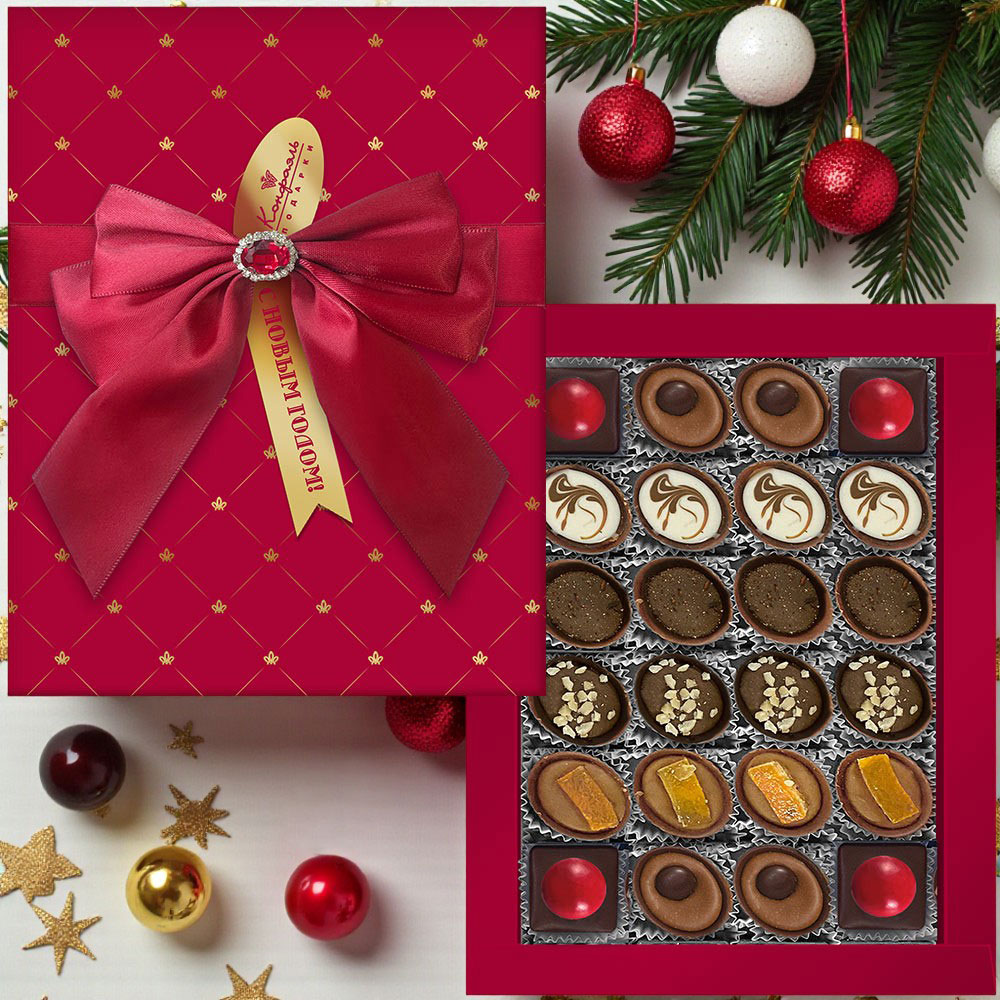 Состав: шоколадные массы - сахар, масло какао, молоко цельное сухое, какао тертое, какао-порошок, сыворотка молочная сухая, молочный жир, паста ореховая из ядер фундука, эмульгаторы (соевый лецитин, Е476), соль, ароматизаторы; начинки - сахар, патока, масло какао, тертое какао, молоко сгущенное (молоко цельное, сахар (сахароза, лактоза)), сухое обезжиренное, сливки сгущенные с сахаром (сливки нормализованные, сахар (сахароза), лактоза), молоко сухое цельное, масла растительные рафинированные дезодорированные (подсолнечное, рапсовое, оливковое; масло сладко-сливочное, молоко сухое обезжиренное), кранч «Апельсин», паста из кофе (кофе, растительный жир), гвоздика, корица, карамелизированный сахар, кардамон, ваниль, рис воздушный с какао (крупа рисовая, сахар, какао, соль), посыпка карамелизованная (фундук в пралине), цукаты апельсиновых корочек, ананас сушеный, кофе натуральный молотый, зёрна кофе натурального жареного, стабилизатор (мальтодекстрин), желирующие агенты (агар), коньяк (дистиллят коньячный, вода, сахар, пищевой краситель «Сахарный колер»), консервант (сорбиновая кислота), регулятор кислотности (лимонная кислота), эмульгаторы (лецитин соевый, Е471), ароматизаторы, декор - пищевые красители (красный свекольный), кандурин красный, глазирователь (капол).
