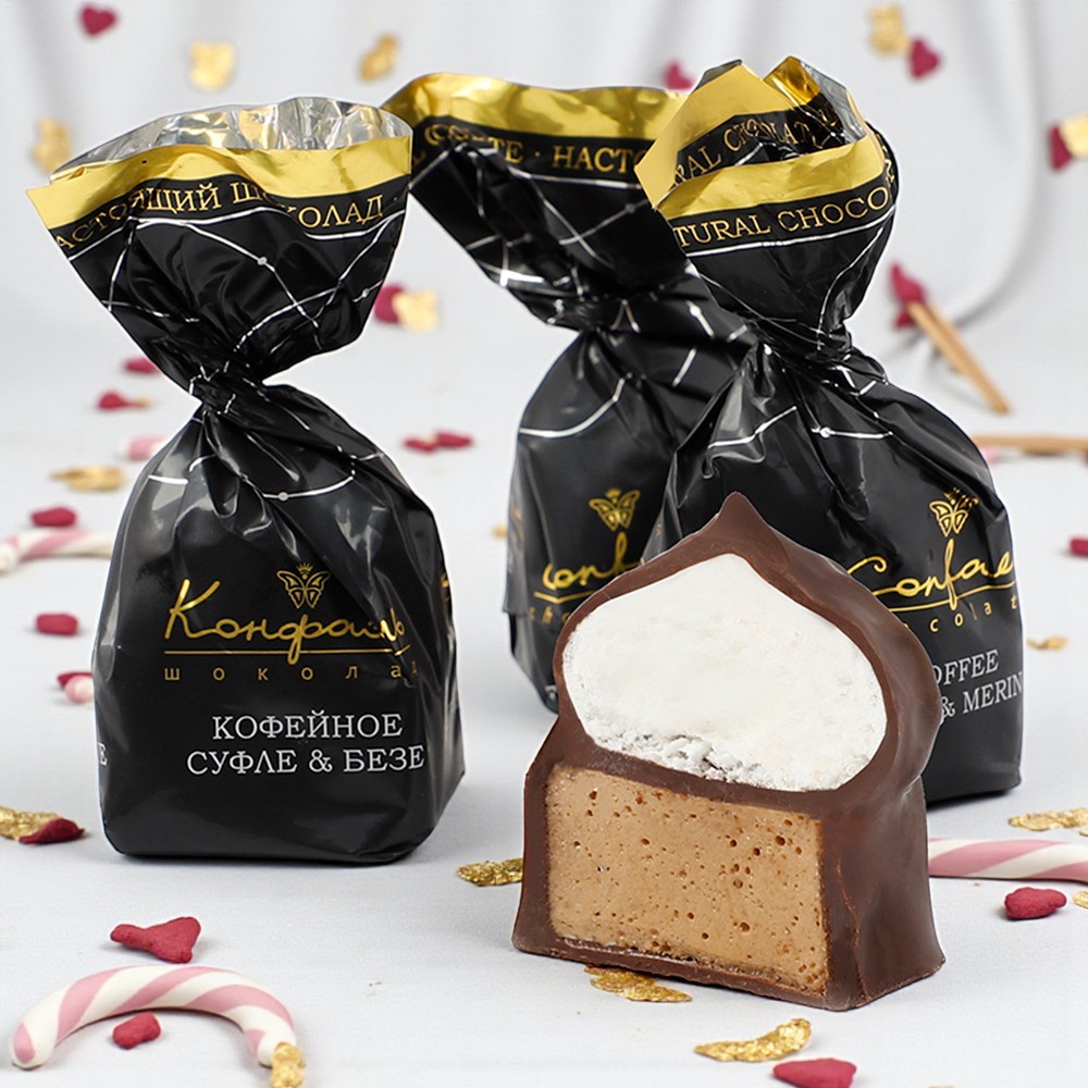 Откройте для себя неповторимый вкус новогоднего десерта, созданного настоящими мастерами кондитерского искусства. Наш эксклюзивный набор конфет сочетает в себе нежнейшее суфле и хрустящее безе, окутанные благородным шоколадом.