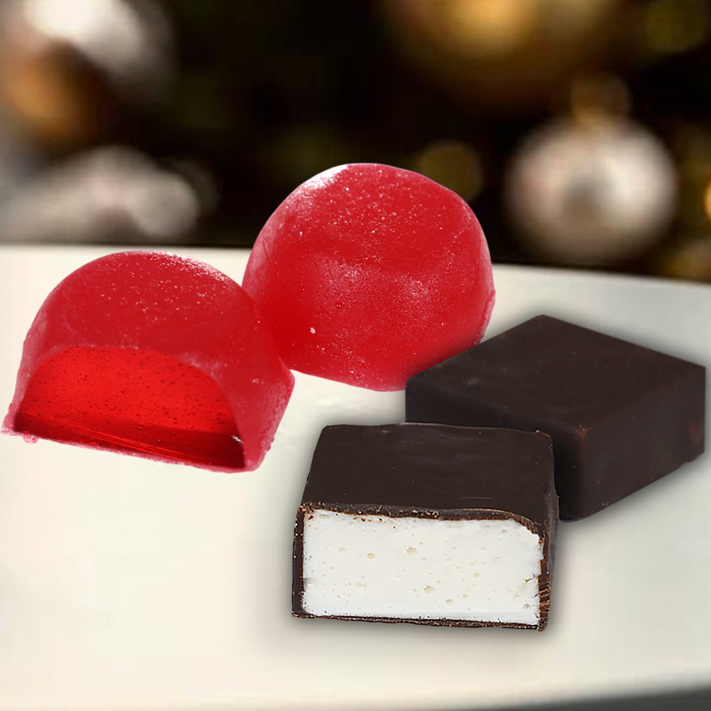 Мармелад желейный "Вишневый", конфеты глазированные горьким шоколадом "Суфле" (ванильное)