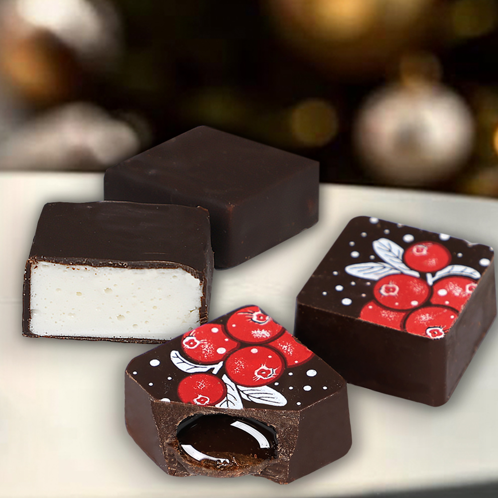 Состав: шоколадная масса - сахар, тертое какао, масло какао, какао-порошок, эмульгатор (лецитин соевый), натуральная ваниль; начинки - сахар, патока, молоко сгущенное (молоко цельное, сахар (сахароза, лактоза)), масло сладко - сливочное, белок яичный порошкообразный, натуральный концентрированный клюквенный сок, стабилизатор (гуммиарабик), желирующий агент (агар), спирт этиловый ректификованный, консервант (сорбиновая кислота), регулятор кислотности (лимонная кислота), экстракт ванили, ароматизатор; декор - пищевые красители (Е171, свекольный концентрат) Продукция производится на предприятии, где используются арахис, кунжут, орехи, яичные и молочные продукты, злаки, содержащие глютен.
