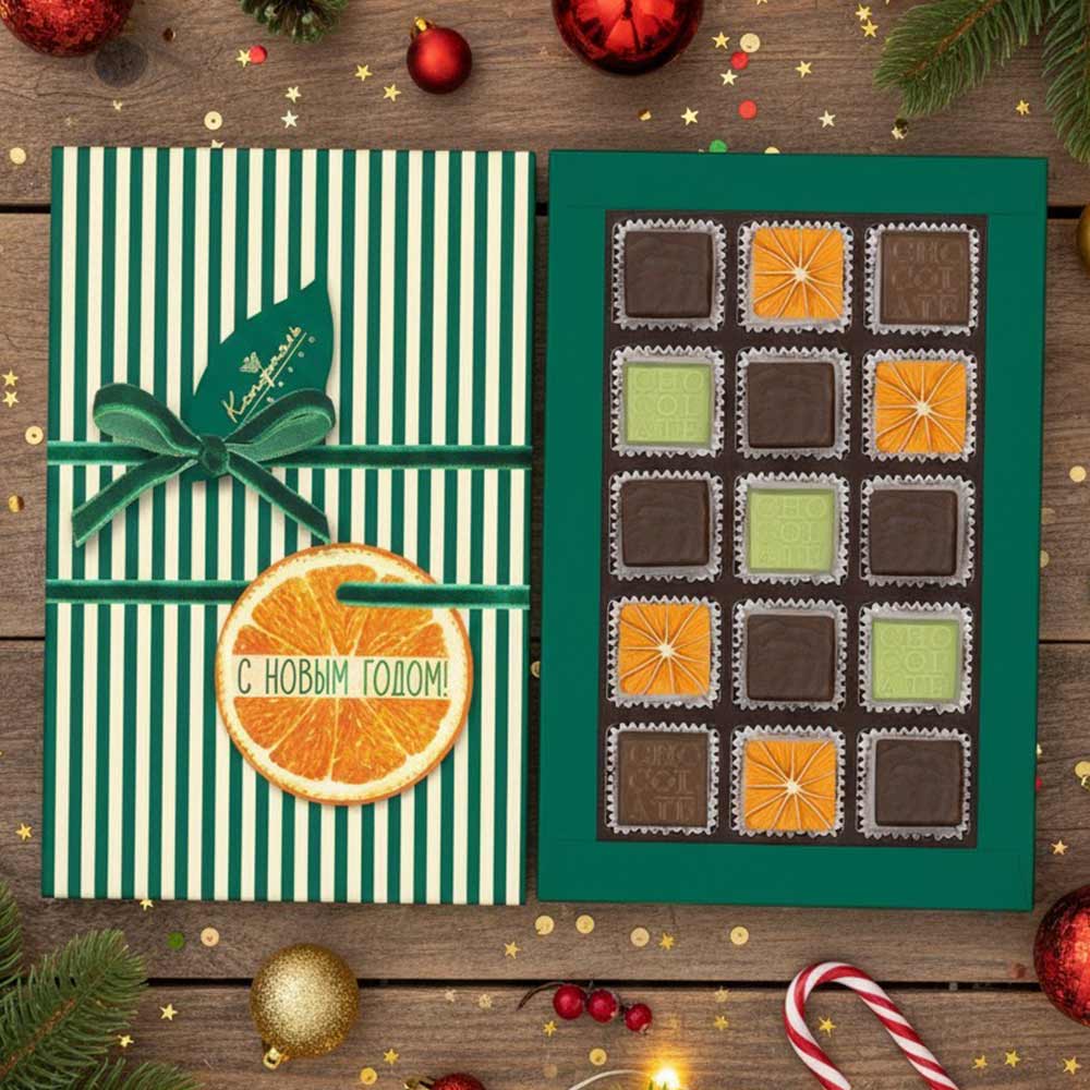 Молочный шоколад с кремовой начинкой со вкусом фисташки с вафельной крошкой, ассорти белый шоколад с декором- кремовая начинка "Миндаль", ассорти зеленый шоколад со сливочной начинкой "Чай Матча", конфеты «Суфле» в горьком шоколаде (апельсиновое)