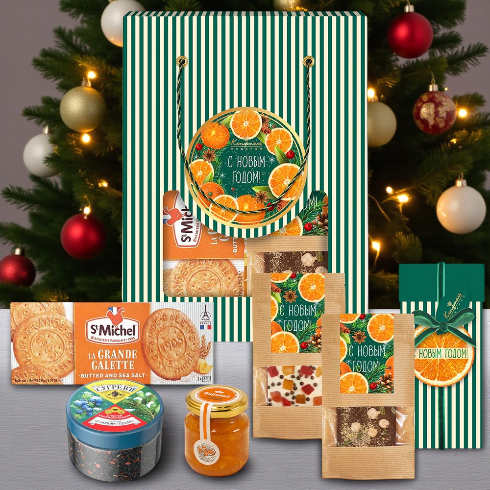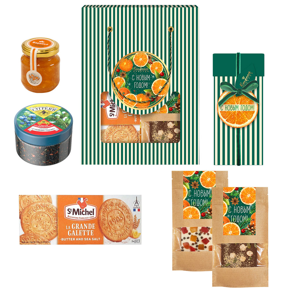 Новогодний пакет с конфетами: мармелад, шоколад, варенье, чай 630г