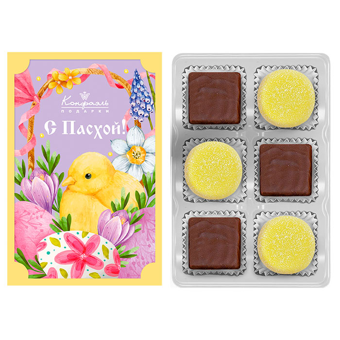 Состав: шоколадные массы – сахар, тертое какао, какао-порошок, масло какао, эмульгаторы (лецитин соевый, Е476), ароматизаторы; начинки – сахар, патока, молоко сгущенное (молоко цельное, сахар (сахароза, лактоза)), масло сладко-сливочное, белок яичный, желирующий агент (агар), желатин говяжий, консервант (сорбиновая кислота), регулятор кислотности (лимонная кислота), ароматизаторы, пищевой краситель «Куркумин». Внимание! Продукция производится на предприятии, где используются арахис, кунжут, орехи, яичные и молочные продукты, злаки, содержащие глютен.