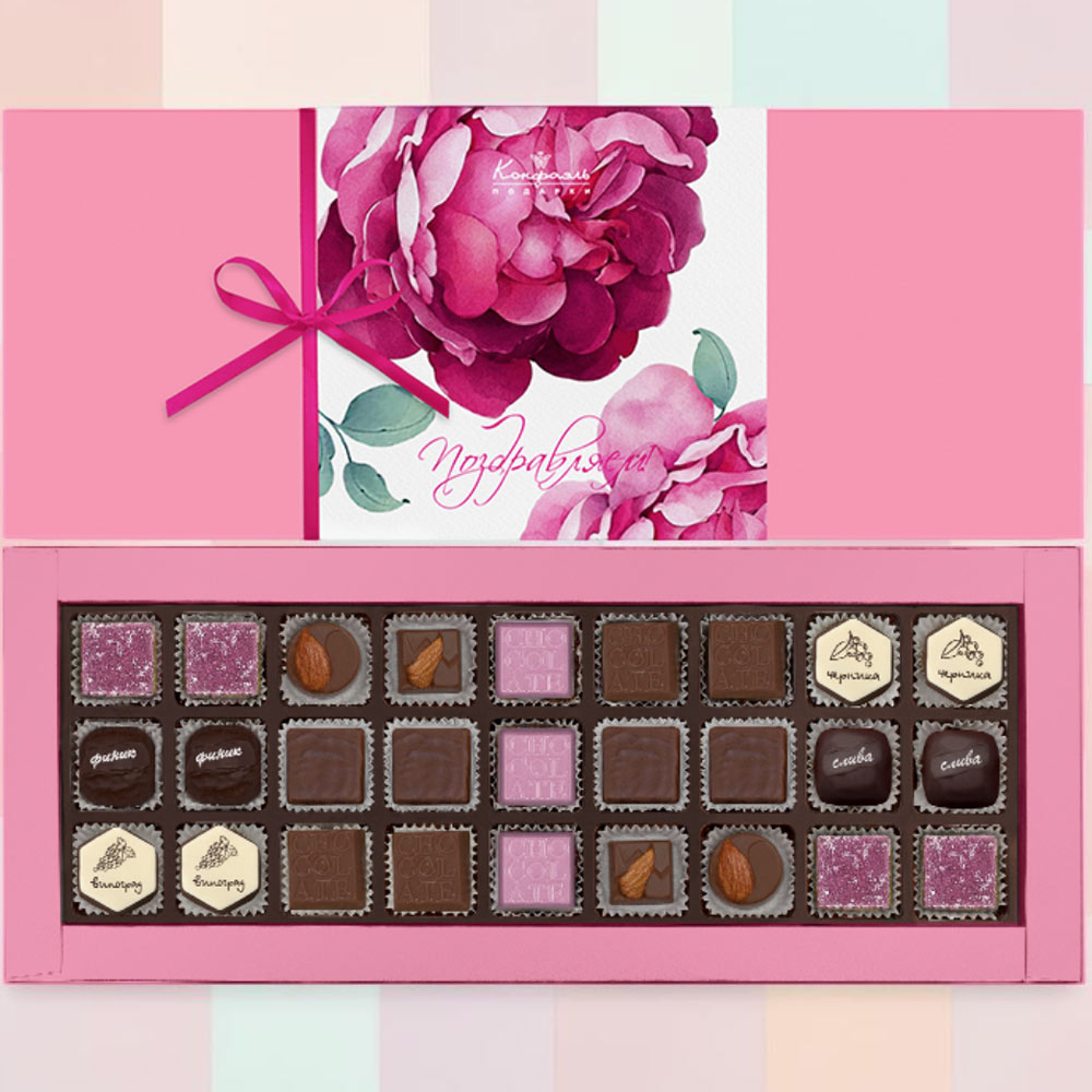 Состав: шоколадные массы - сахар, тертое какао, какао-порошок, масло какао, сыворотка молочная сухая, пахта сухая, сухое цельное молоко, эмульгатор (лецитин соевый); начинки - сахар, патока, масло какао, тертое какао, молоко сгущенное (молоко цельное, сахар (сахароза, лактоза)), сливки сгущенные с сахаром (сливки нормализованные, сахар (сахароза), лактоза), рафинированные дезодорированные (подсолнечное, рапсовое, оливковое; масло сливочное (из пастеризованных коровьих сливок), молоко сухое обезжиренное), масло сладко-сливочное, белок яичный, натуральные концентрированные соки (виноград, черника), финики, чернослив, ядра орехов миндаля, сахарная пудра, стабилизатор (мальтодекстрин), желирующие агенты (агар, желатин говяжий), коньяк (дистиллят коньячный, вода, сахар, пищевой краситель «Карамельный колер»), спирт этиловый ректификованный, экстракт лаванды, консервант (сорбиновая кислота), регулятор кислотности (лимонная кислота), эмульгаторы (лецитин соевый, Е471), ароматизаторы, пищевой краситель «Карамельный колер», декор - пищевые красители (Е132, Е171, свекольный концентрат). Внимание! В продукте возможно наличие фрагментов фруктовых косточек (кураги натуральной, фиников натуральных, чернослива натурального). Продукция производится на предприятии, где используются арахис, кунжут, орехи, яичные и молочные продукты, злаки, содержащие глютен.