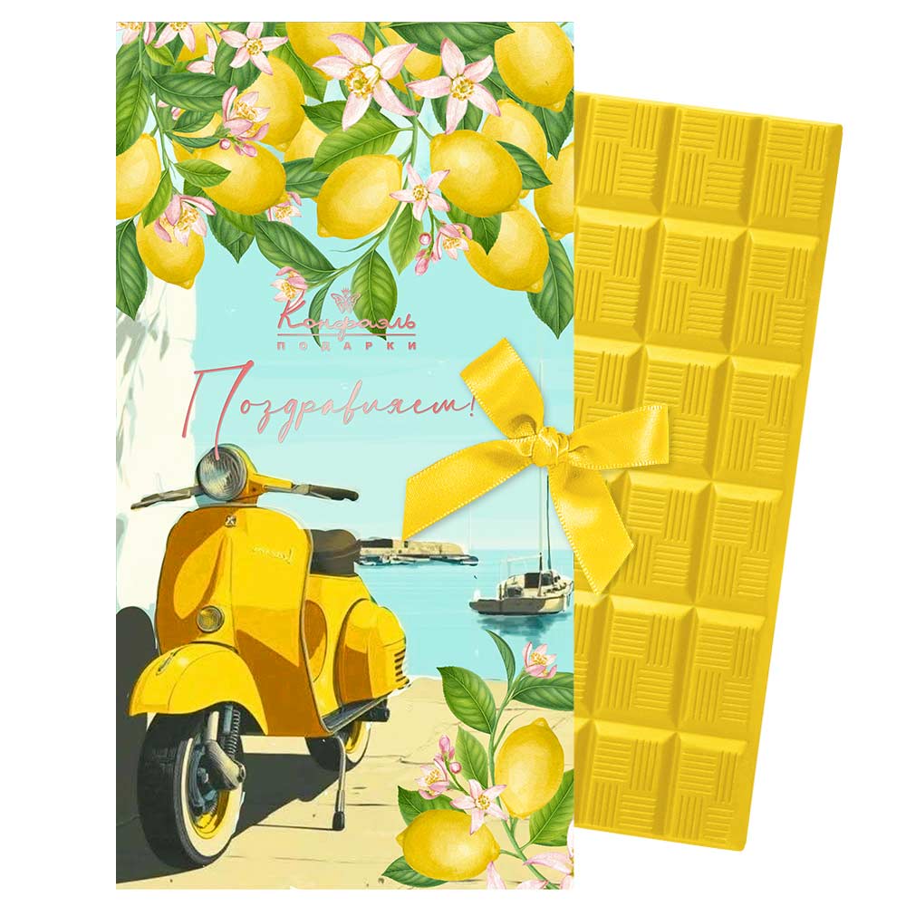 Состав: шоколад - сахар, молоко сухое цельное, масло какао, эмульгатор (лецитин соевый), соль, экстракт лимона ароматизаторы, пищевой краситель куркумин.