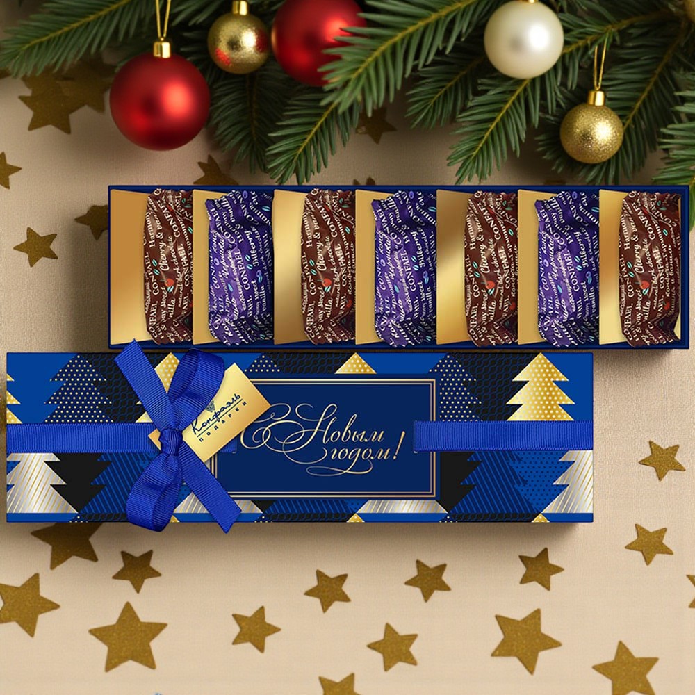 Состав: шоколадная масса – сахар, тертое какао, масло какао, какао-порошок, эмульгатор (лецитин соевый), натуральная ваниль; начинки – сахар, патока, молоко сгущенное (молоко цельное, сахар (сахароза, лактоза)), масло сладко-сливочное, белок яичный, натуральные концентрированные соки (черничный, вишневый), желирующие агенты (агар, желатин говяжий), регулятор кислотности (лимонная кислота), ароматизаторы. Продукция производится на предприятии, где используются арахис, кунжут, орехи, яичные и молочные продукты, злаки, содержащие глютен.