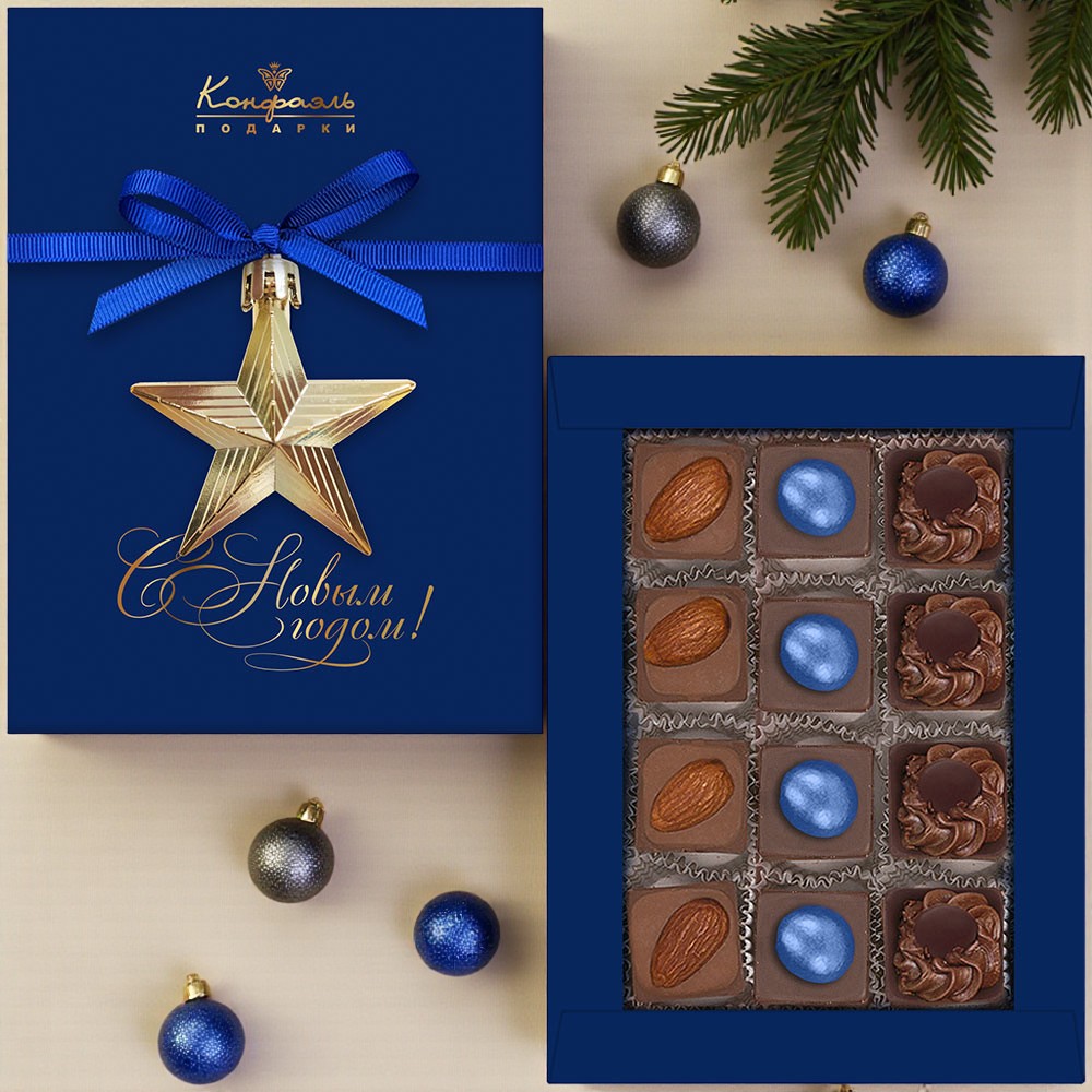 Состав: шоколадная масса – сахар, тертое какао, масло какао, какао-порошок, сыворотка молочная сухая, тертое какао, пахта сухая, эмульгатор (лецитин соевый), натуральная ваниль; начинки – сахар, патока, какао-масло, какао тертое, молоко сгущенное (молоко цельное, сахар (сахароза, лактоза)), молоко сухое цельное, молоко сухое обезжиренное, ананас сушеный, ядра орехов миндаля, фундук жареный тертый, марципановая масса, коньяк (дистиллят коньячный, вода, сахар, натуральный пищевой краситель («сахарный колер»), спирт этиловый ректификованный, регулятор кислотности (лимонная кислота), эмульгаторы (лецитин соевый, Е471), ароматизаторы; декор – пищевой краситель кандурин синий, глазирователь (капол).