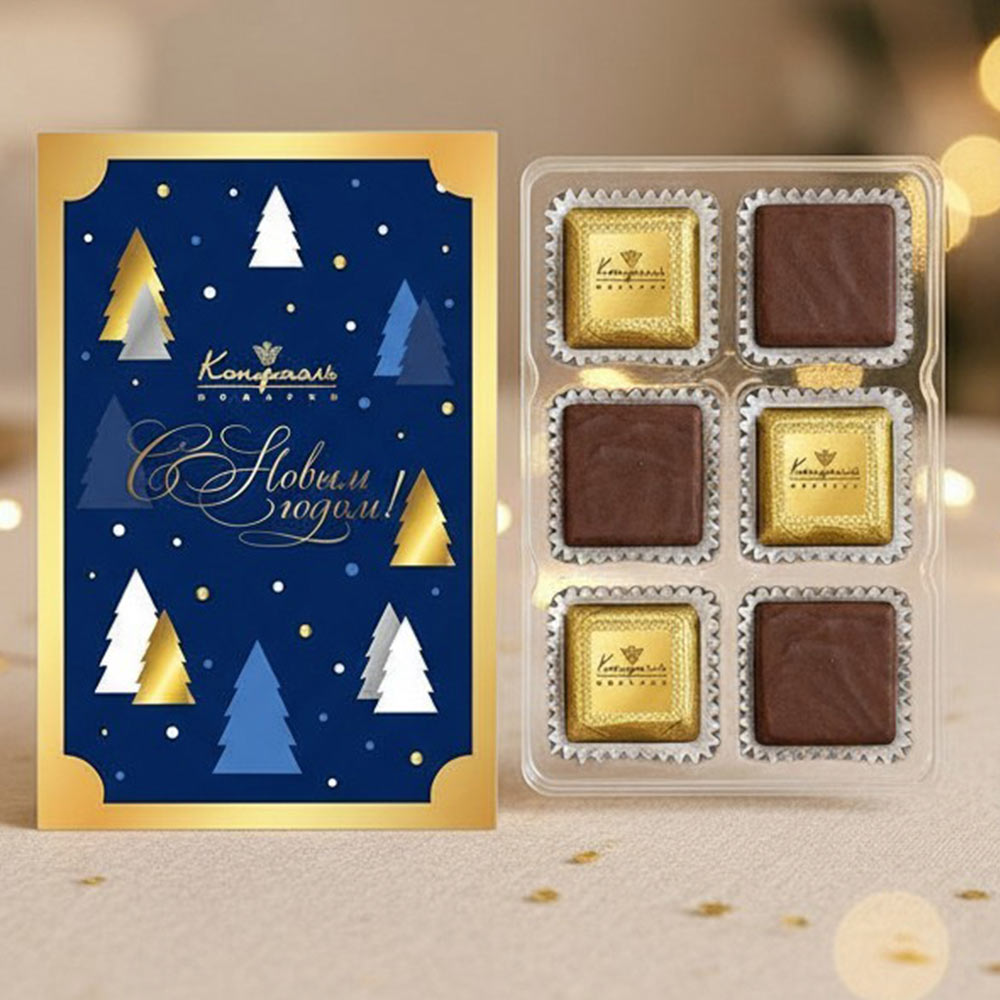 Праздник вкуса и радости уже близко! Удивите своих близких и друзей необычным и вкусным подарком – шоколадные конфеты ассорти с сливочной начинкой и ананасовое суфле в горьком шоколаде "С Новым годом"