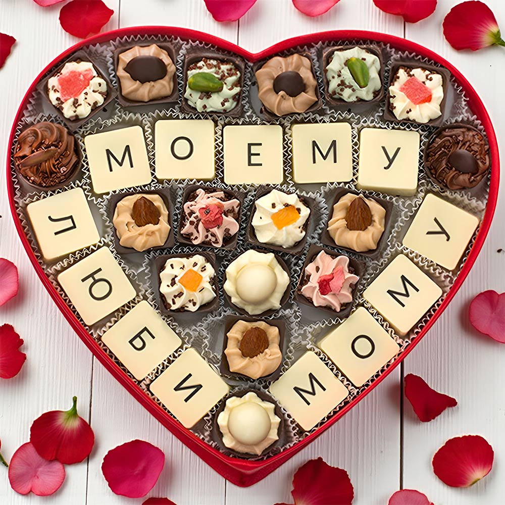 шоколадные массы – какао-масло, какао-тертое, сахар, молоко сухое цельное, молоко сухое обезжиренное, лактоза, эмульгатор (лецитин соевый), ароматизатор («Ванилин»); начинки – сахар, патока, фруктоза, какао-масло, какао тертое, молоко сгущенное (молоко цельное, сахар (сахароза, лактоза)), молоко сухое цельное, молоко сухое обезжиренное, рафинированные дезодорированные растительные масла, масло сладко-сливочное, натуральные концентрированные соки, клубника сублимированная, цукаты апельсиновых корочек, папайя сушеная, ядра орехов фундука, ядра орехов миндаля, ядра орехов фисташки, фундук жареный тертый, какао-порошок, кофе натуральный молотый, стабилизатор (мальтодекстрин), лактоза, коньяк (дистиллят коньячный, вода, сахар, натуральный пищевой краситель «Карамельный колер»), спирт этиловый ректификованный, консервант (сорбиновая кислота), эмульгаторы (лецитин соевый, Е471), ароматизаторы («Апельсин», «Ваниль», «Ванилин», «Фисташка», «Земляника», «Миндаль», «Кофе», «Кокосовые сливки»), натуральные пищевые красители «Карамельный колер», комплекс меднохлорофиллов; декор – пищевые красители (куркумин, Е120, Е132, Е171).