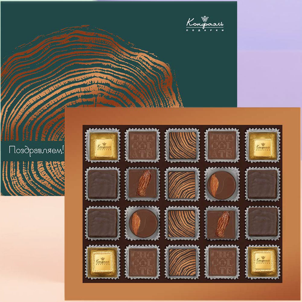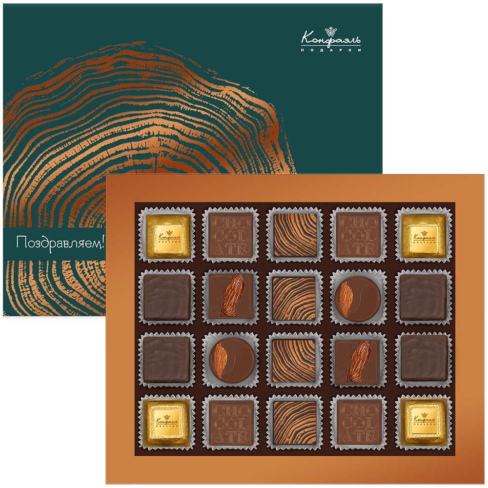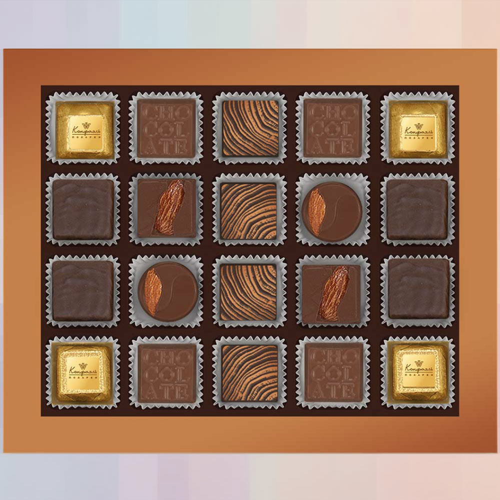 Состав: шоколадные массы - сахар, масло какао, молоко цельное сухое, какао тертое, какао-порошок, сыворотка молочная сухая, молочный жир, паста ореховая из ядер фундука, эмульгатор (соевые лецитин), соль, ароматизаторы; начинки - сахар, патока крахмальная карамельная, молоко сгущенное (молоко цельное, сахар (сахароза, лактоза)), масла растительные рафинированные дезодорированные (подсолнечное, рапсовое, оливковое; масло сладко-сливочное, молоко сухое обезжиренное), жир специального назначения (масло ши, рапсовое масло, соевое масло, регулятор кислотности (лимонная кислота)), молоко сухое цельное, молоко сухое обезжиренное), вафельная крошка (мука пшеничная х/п первого сорта, сахар, масло кокосовое рафинированное дезодорированное, эмульгатор( лецитин соевый), пшеничные волокна (клетчатка), ароматизатор), масло сладко - сливочное, белок яичный, ядра орехов миндаля, стабилизатор (мальтодекстрин), желирующий агент (агар), коньяк (дистиллят коньячный, вода, сахар, пищевой краситель «Сахарный колер»), консервант (сорбиновая кислота), регулятор кислотности (лимонная кислота), эмульгаторы (лецитин соевый, Е471), экстракт лимона, экстракт ванили, ароматизаторы, пищевые красители «Сахарный колер», комплекс меднохлорофиллов; декор - пищевые красители (Е132, Е171, куркумин, свекольный концентрат, комплекс меднохлорофиллов). Продукция производится на предприятии, где используются арахис, кунжут, орехи, яичные и молочные продукты, злаки, содержащие глютен.