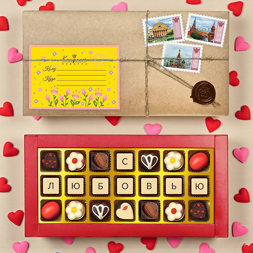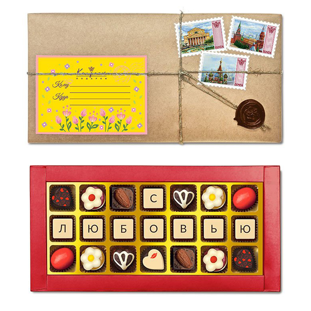 шоколадные массы – какао-масло, какао-тертое, сахар, молоко сухое цельное, молоко сухое обезжиренное, лактоза, эмульгатор (лецитин соевый), ароматизаторы («Ванилин», «Земляника»), эмульгатор (Е476), краситель натуральный пищевой («Кармин»); начинки – сахар, патока, какао-масло, какао тертое, молоко сгущенное (молоко цельное, сахар (сахароза, лактоза)), молоко сухое цельное, молоко сухое обезжиренное, рафинированные, дезодорированные, растительные масла, натуральные концентрированные соки, кумкват, ядра орехов миндаля, фундук жареный тертый, марципановая масса, стабилизатор (мальтодекстрин), желирующие агенты (агар, желатин), коньяк (дистиллят коньячный, вода, сахар, натуральный пищевой краситель «Карамельный колер»), спирт этиловый ректификованный, консервант (сорбиновая кислота), регулятор кислотности (лимонная кислота), эмульгаторы (лецитин соевый, Е471), ароматизаторы («Апельсин», «Вишня», «Ваниль», «Миндаль», «Клубника», «Кокосовые сливки»),натуральные пищевые красители «Карамельный колер», декор – пищевые красители
