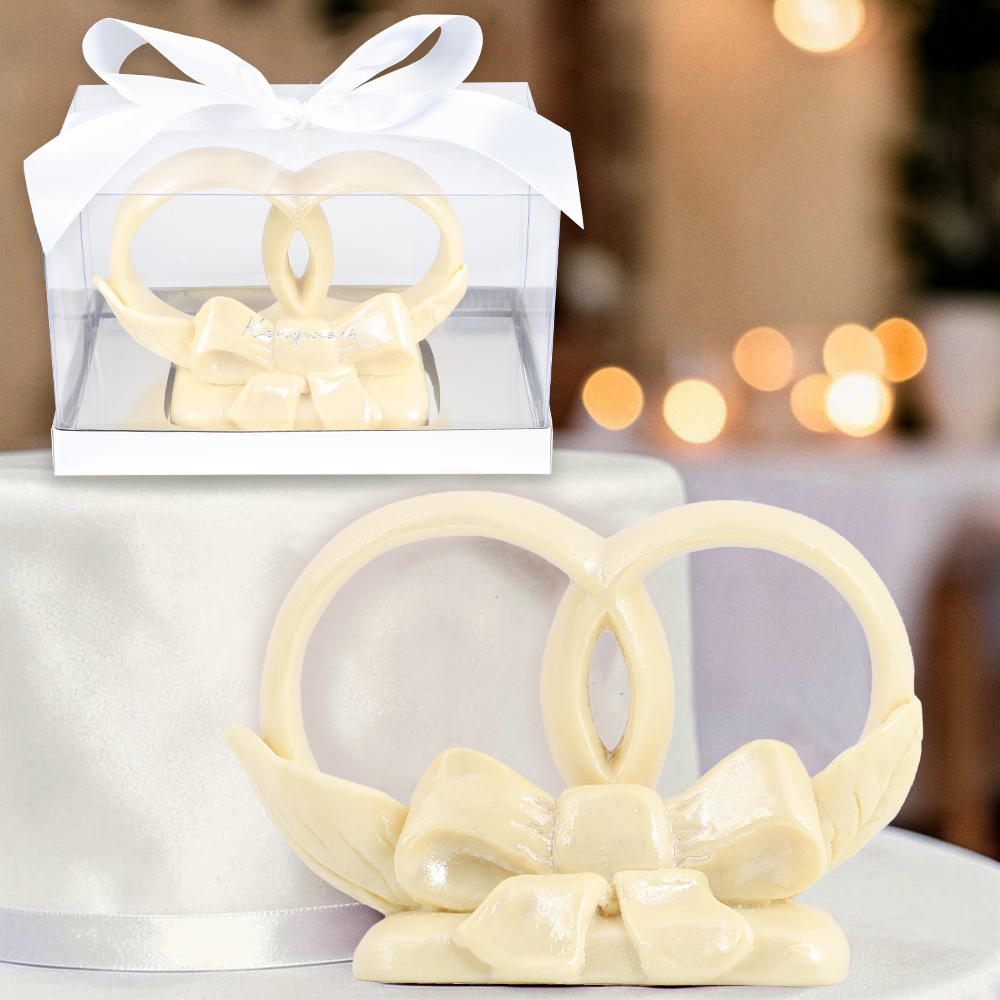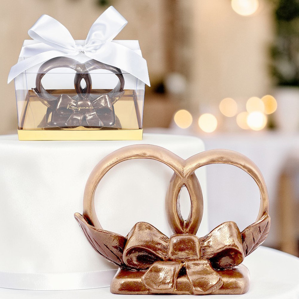 Свадебные кольца из молочного шоколада в прозрачной упаковке - романтичный символ союза жениха и невесты и их надежд на сладкую жизнь.