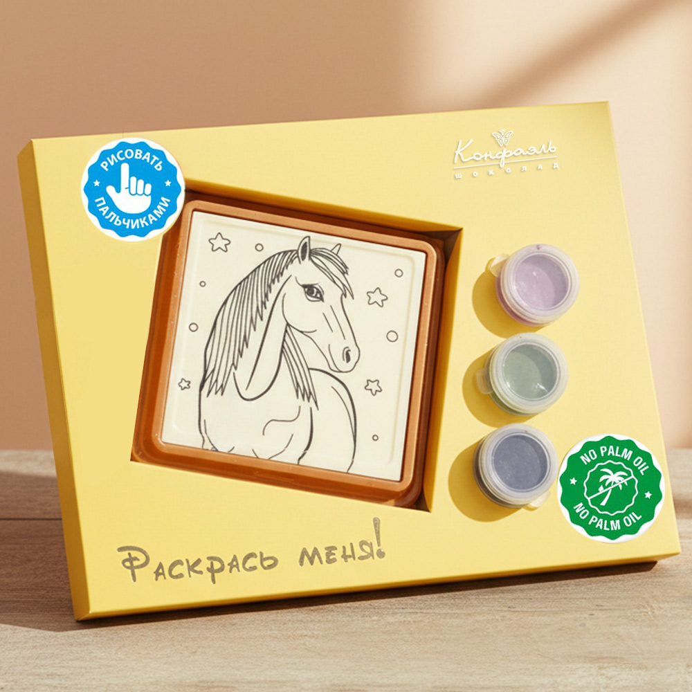 Встречайте год Лошади с особенным угощением — съедобной раскраской из белого шоколада c рисунком символа 2026 года! Превратите подготовку к празднику в увлекательное творчество для всей семьи.