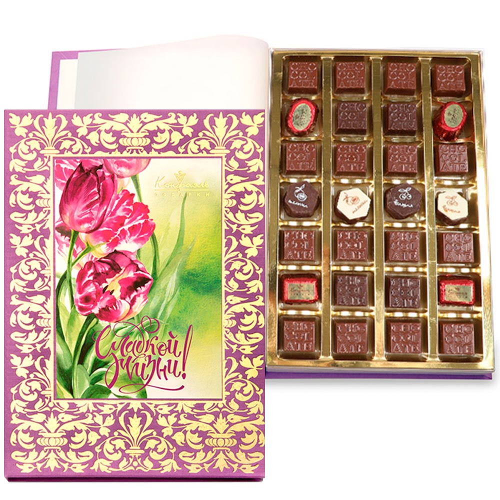В этом подарочном наборе, в виде декоративной книги, вы найдете конфеты со сливочными и шоколадными начинками, а также желе, глазированное горьким шоколадом.