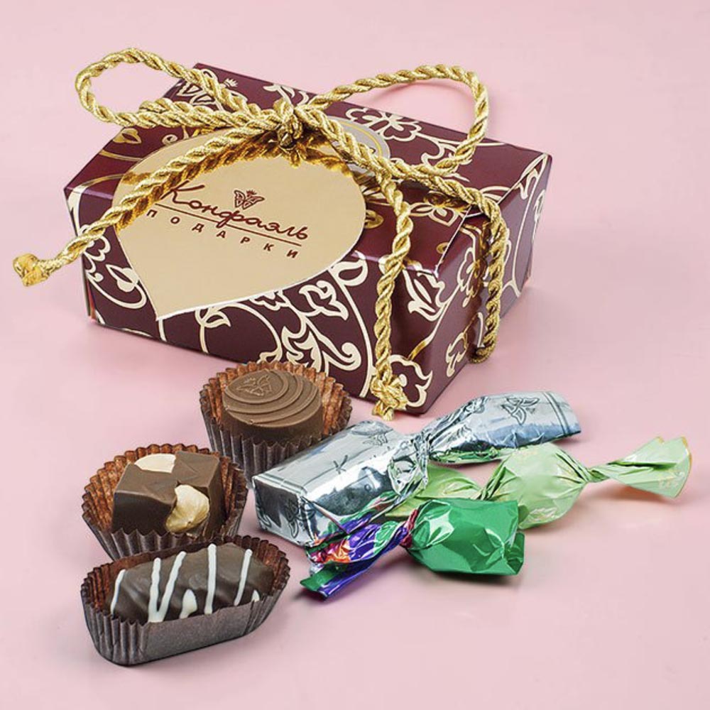 шоколадные массы – какао тертое, сахар, какао-масло, молоко сухое цельное, молоко сухое обезжиренное, лактоза, эмульгатор (лецитин соевый), ароматизатор («Ванилин»); начинки – сахар, патока, какао-масло, какао тертое, молоко сгущенное (молоко цельное, сахар (сахароза, лактоза)), молоко сухое цельное, молоко сухое обезжиренное, рафинированные дезодорированные растительные масла, абрикос сушеный, папайя сушеная, ананас сушеный, мандарин (кумкват) сушеный, ядра орехов миндаля, ядра орехов фундука, какао-порошок, лактоза, стабилизатор (мальтодекстрин), коньяк (дистиллят коньячный, вода, сахар, натуральный пищевой краситель «Карамельный колер»), спирт этиловый ректификованный, консервант (сорбиновая кислота), регулятор кислотности (лимонная кислота), эмульгаторы (лецитин соевый, Е471), ароматизаторы, натуральный пищевой краситель «Карамельный колер».