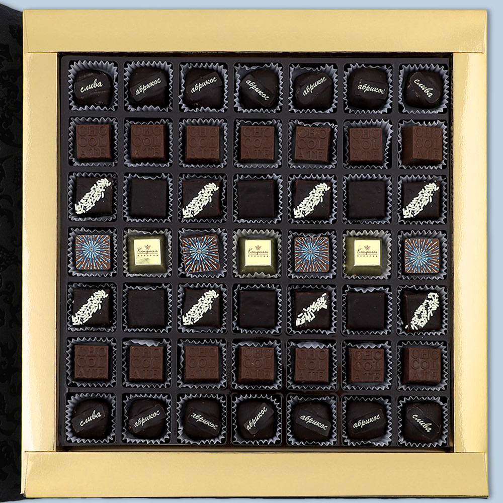 Шоколадные конфеты «Ассорти» со сливочными и шоколаданой начинками, с кремовой начинкой и декором ( "Шампанское и ананас"), конфеты «Суфле» в горьком шоколаде (ванильное),конфеты «Мягкий грильяж» в горьком шоколаде, конфеты «сухофрукты» в горьком шоколаде с декором(финик, слива, абрикос)