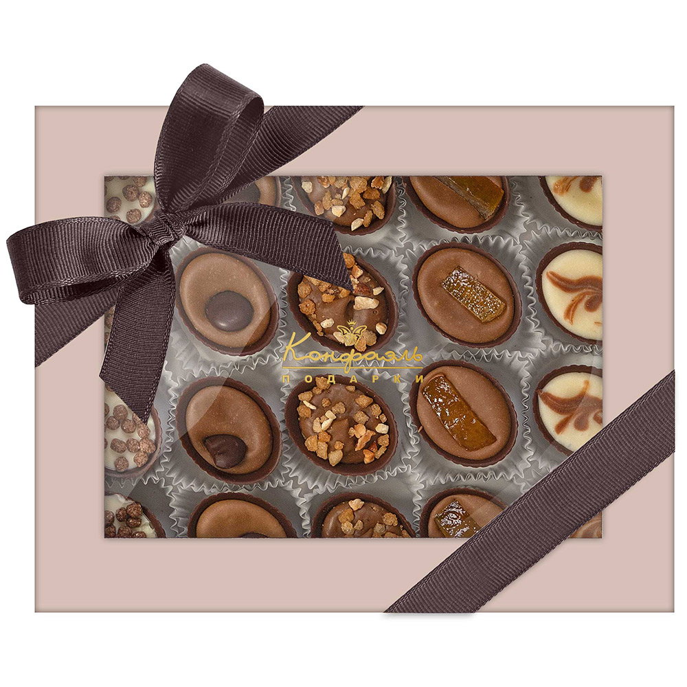 Состав: шоколад – сахар, какао тёртое, масло какао, эмульгатор (лецитин соевый), ароматизатор; начинки – сахар, какао-масло, молоко сухое обезжиренное, масла растительные рафинированные дезодорированные (подсолнечное, рапсовое, оливковое; масло сливочное (из пастеризованных коровьих сливок), молоко сухое обезжиренное), паста из кофе (кофе, растительный жир), рис воздушный с какао (крупа рисовая, сахар, какао, соль), цукаты апельсиновых корочек, апельсин сушеный, кофе натуральный молотый, эмульгаторы (лецитин соевый, Е471), ароматизаторы. Продукция производится на предприятии, где используются арахис, кунжут, орехи, яичные и молочные продукты, злаки, содержащие глютен.