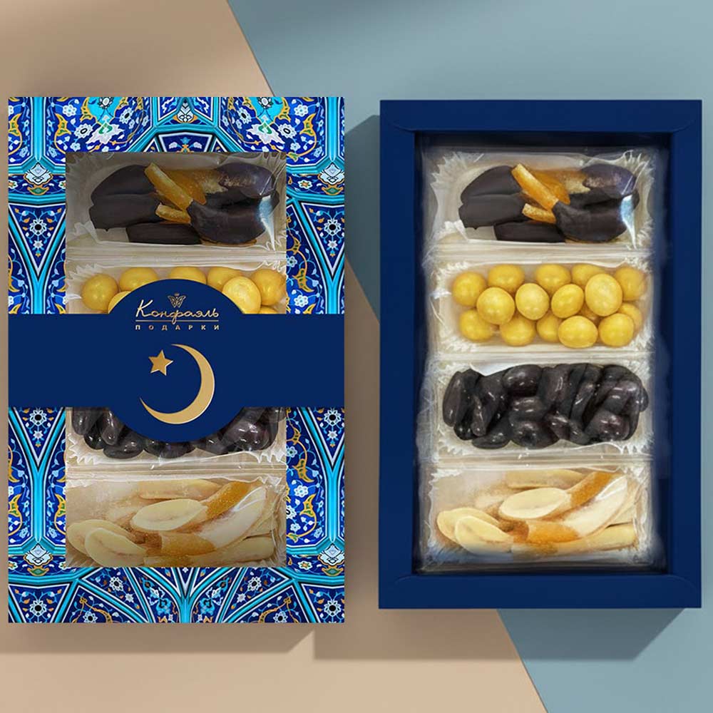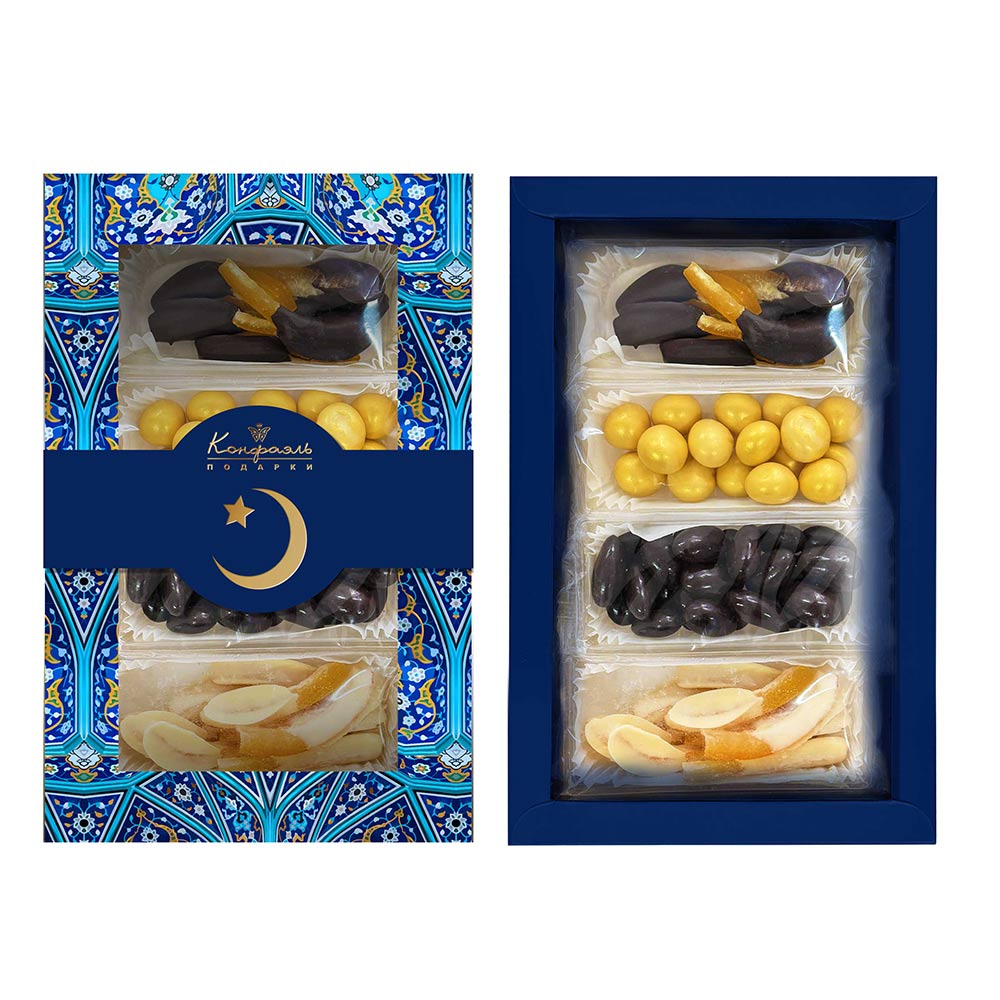 Драже "Миндаль" в молочном шоколаде, драже "Ананас" в белом шоколаде с декором, конфеты глазированные молочным шоколадом "Цукаты" (апельсиновые корочки), конфеты глазированные белым шоколадом "Цукаты" (апельсиновые корочки)
