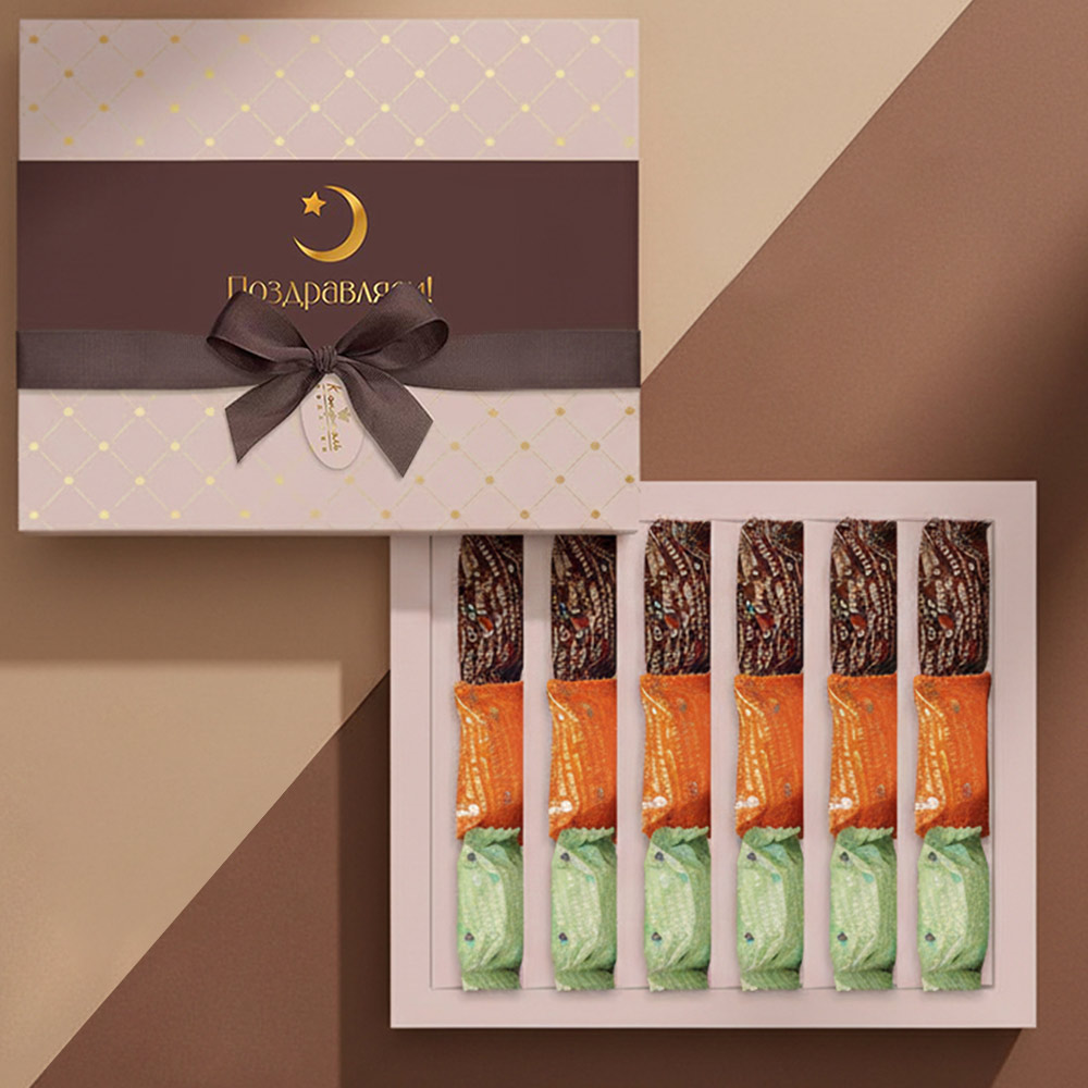 Состав: шоколад – сахар, тертое какао, масло какао, какао-порошок, эмульгатор (лецитин соевый), натуральная ваниль; начинки – сахар, патока, молоко сгущенное (молоко цельное, сахар (сахароза, лактоза)), масло сладко-сливочное, белок яичный, натуральные концентрированные соки (апельсиновый, виноградный, вишневый), желирующие агенты (агар, желатин говяжий), регулятор кислотности (лимонная кислота), ароматизаторы. Продукция производится на предприятии, где используются арахис, кунжут, орехи, яичные и молочные продукты, злаки, содержащие глютен.