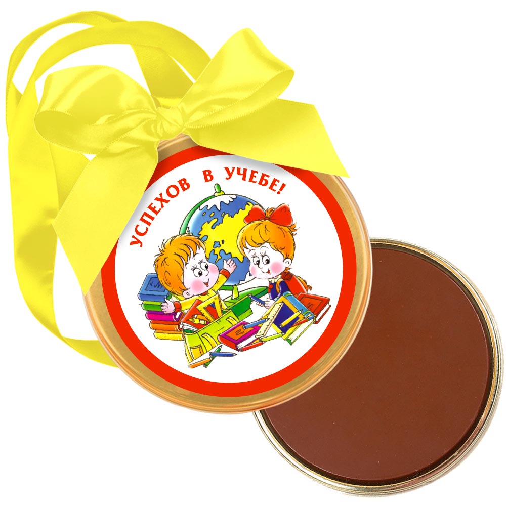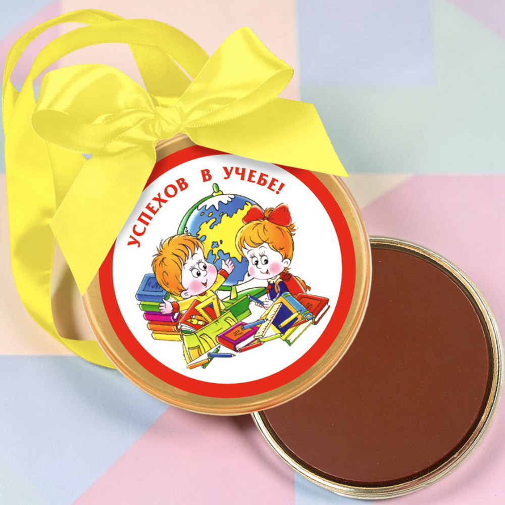 Ребёнок будет счастлив, если подарить ему шоколадную медаль от "Конфаэль", с прекрасным пожеланием «Успехов в учебе» и забавными рисунками.